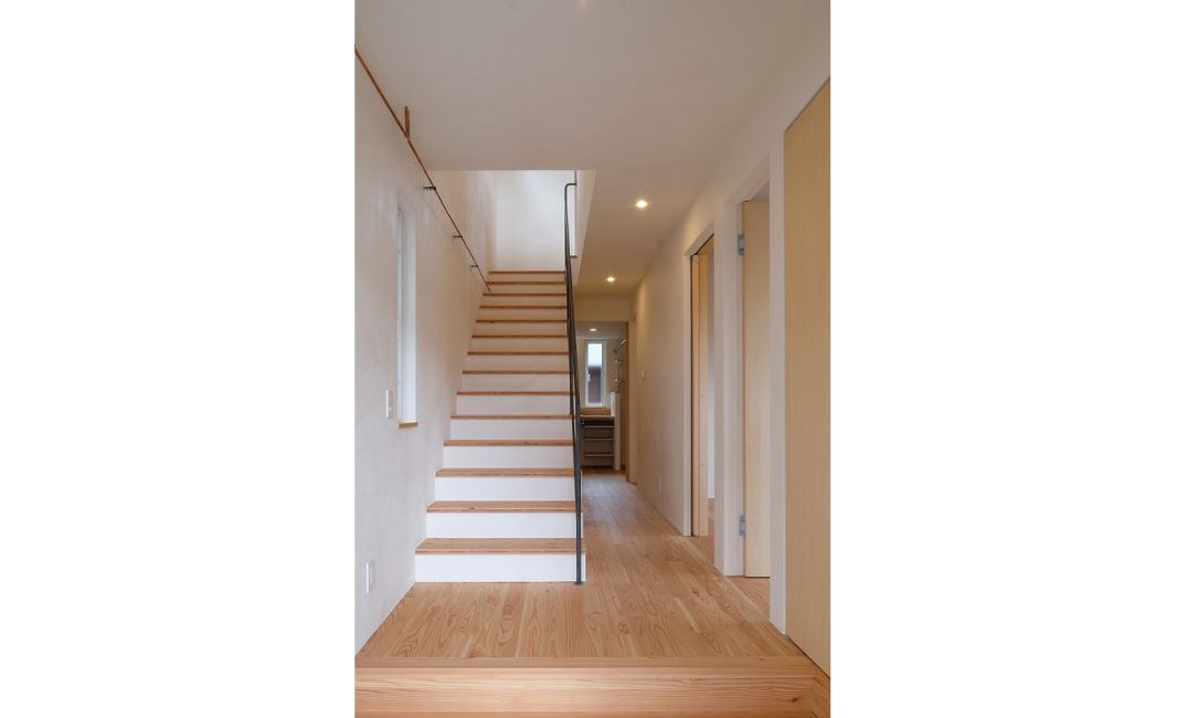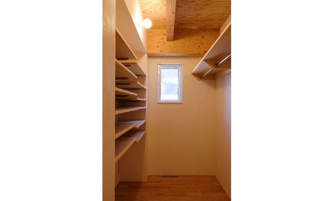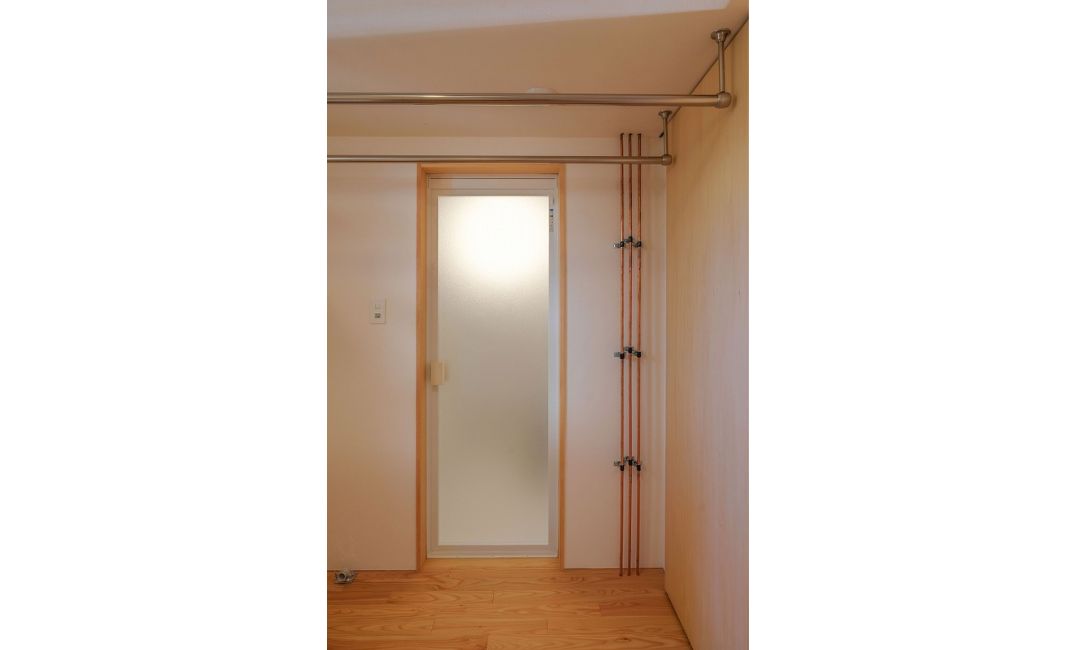 他にも2階のパネルヒーター用の配管を、あえて洗面脱衣所内に現しで設置し、そこからの放熱による暖房効果や、室内物干しの洗濯物が乾きやすくなるように意図しています。