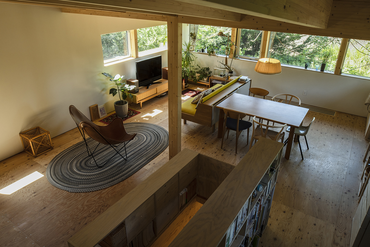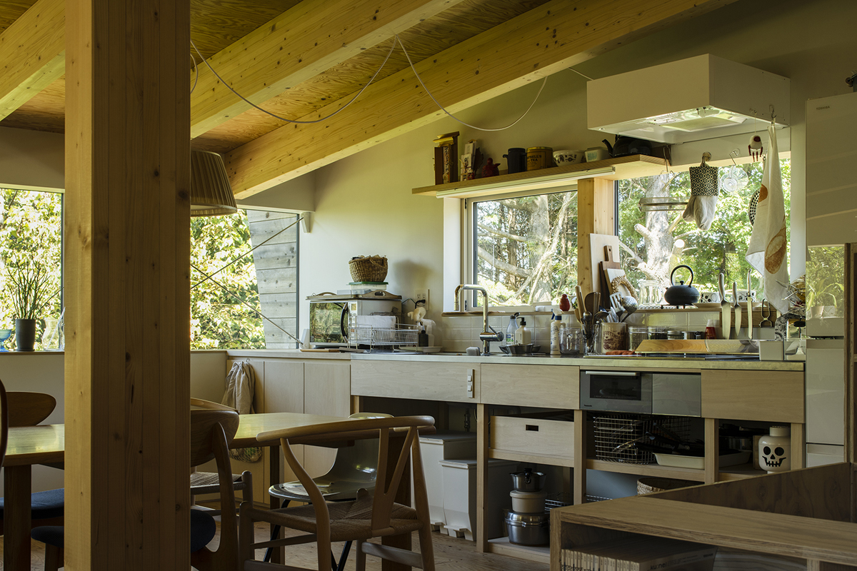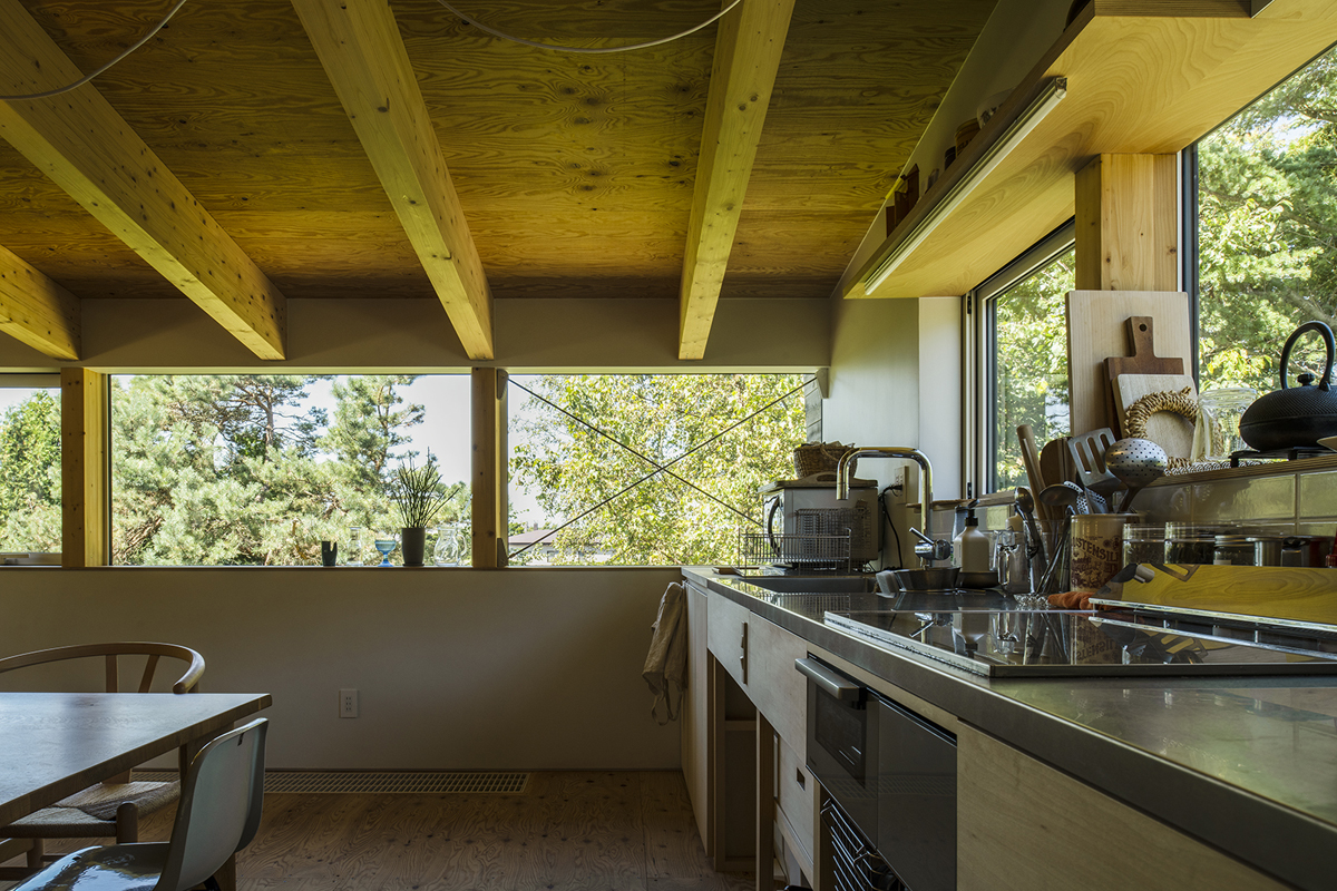 ダイニングキッチンを含む住スペースは2階に配置。一面に設けた窓は、木にとまる鳥たちの目線の位置になるので、鳥たちの生活を身近に感じることができます。お子様も鳥に関心を持ち、詳しくなったそうです。
