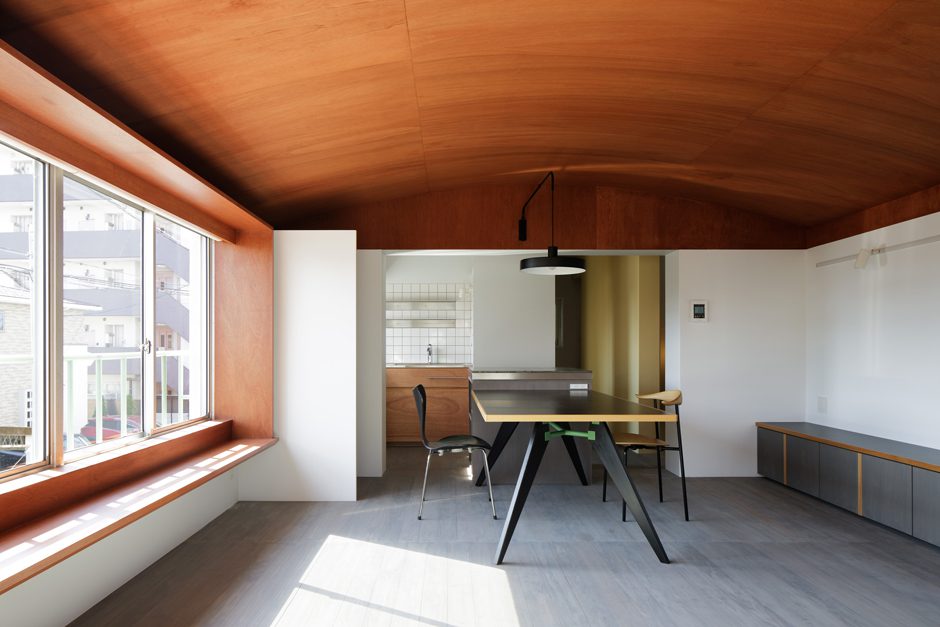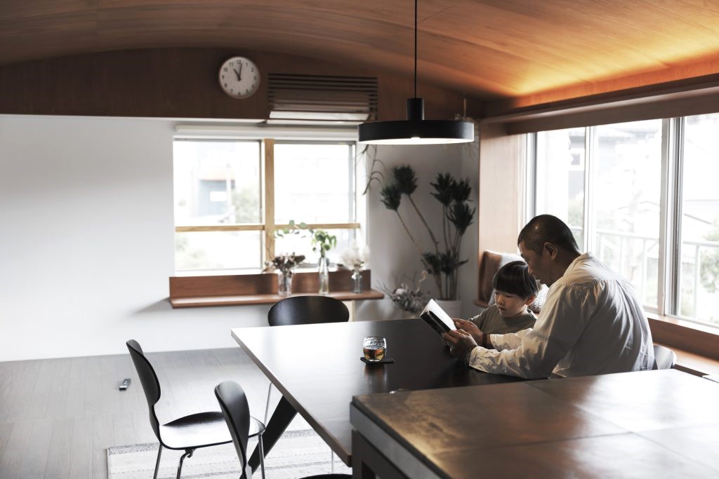 その中でも特徴的なのが、家族がみんなで時間を過ごすリビングです。既存の天井が少し高すぎて落ち着かないと感じたので、丸い曲面の木の天井を設けることで、包まれたような感覚で意識が内側に向くように意図しました。また、天井の木部と壁の境目でまっすぐのラインを生み出すことで、今までそれぞれの窓の高さの違いがあった空間の横のラインを整理しています。