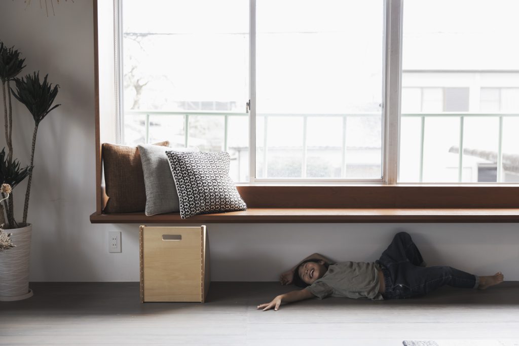 さらに、窓辺のベンチやテレビ台、ダイニングチェアなどを40cmの高さで揃え、低い位置にも統一されたラインを生み出し、部屋の重心を下げることで落ち着く空間を作り出しました。