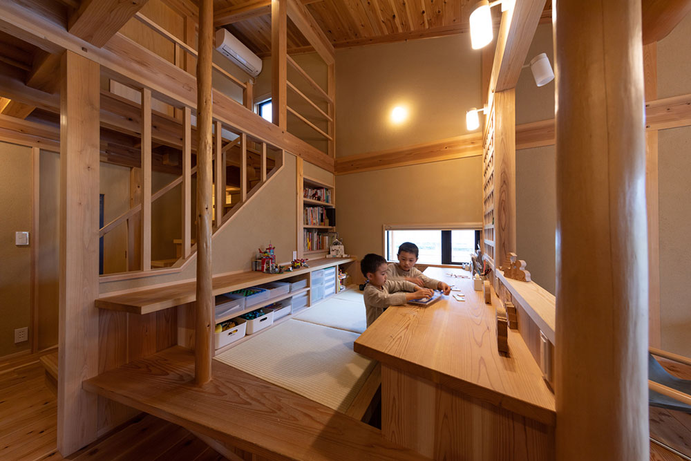 1階の中心にキッチンを配置し、キッチン正面には子どもたちが宿題をしたり遊ぶ書斎コーナー、キッチン横にはダイニング、そしてリビングを配置し、キッチンにいる時間も家族間のコミュニケーションが取りやすくなっています。