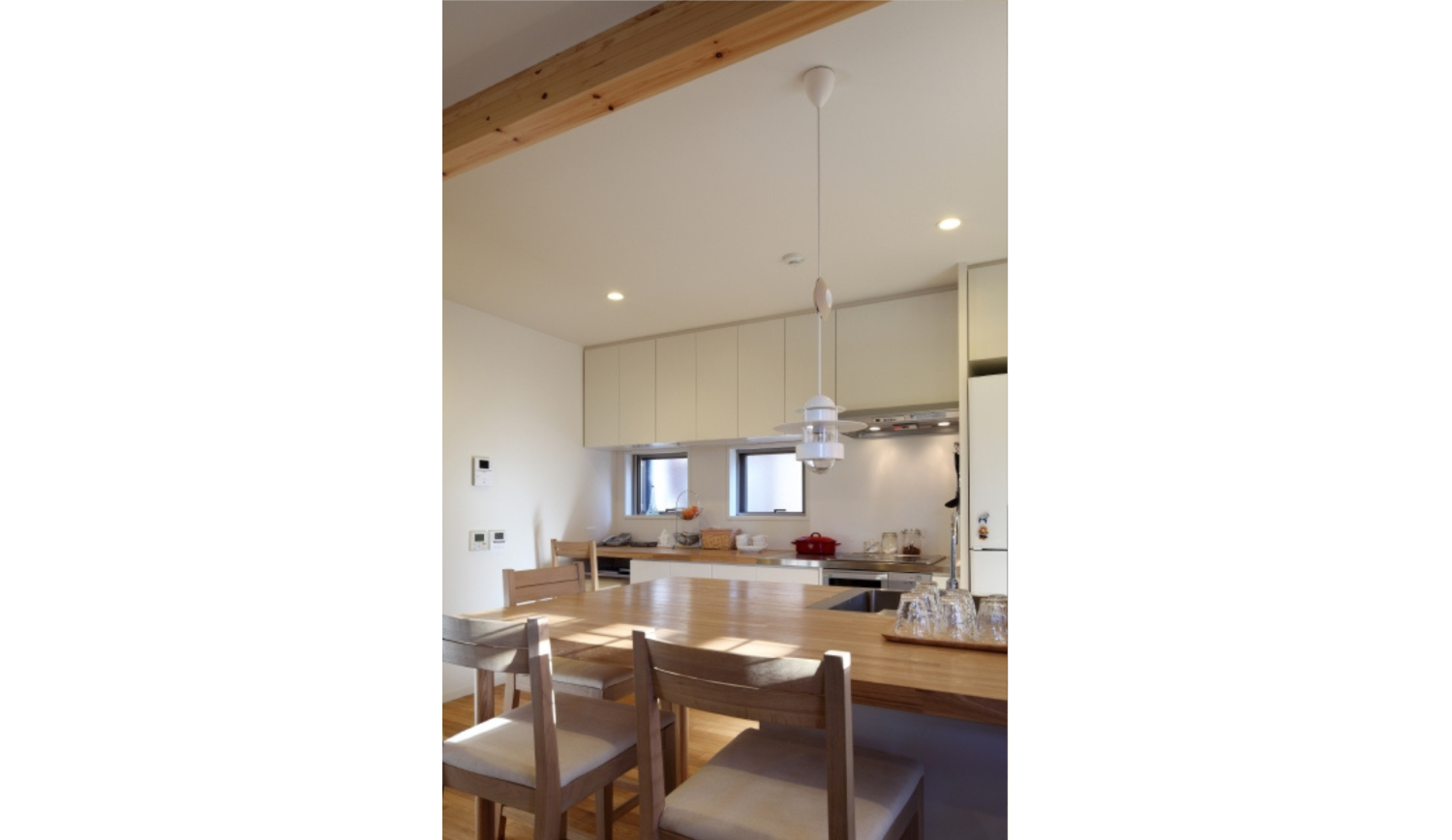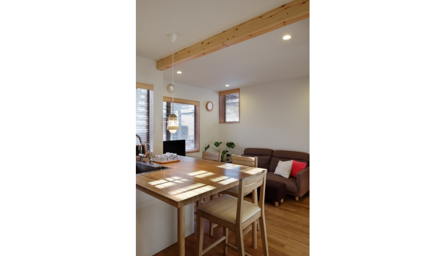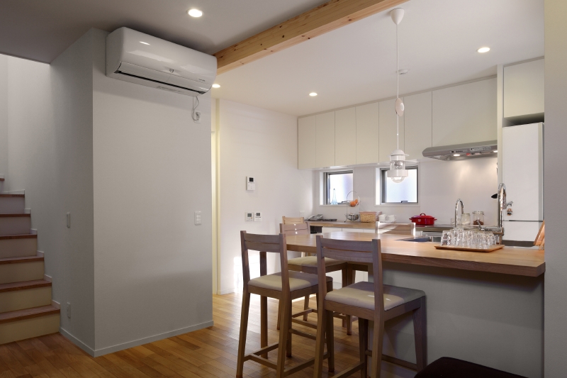 キッチンには、無垢の集成材を使用して造作することで、本物の木ならではの温もりと重厚感のあるキッチンとなりました。ローコストを意識しながらも、長く使うもの、日々手に触れるものは良い素材や製品を採用することで、暮らしの質と満足度が上がります。
