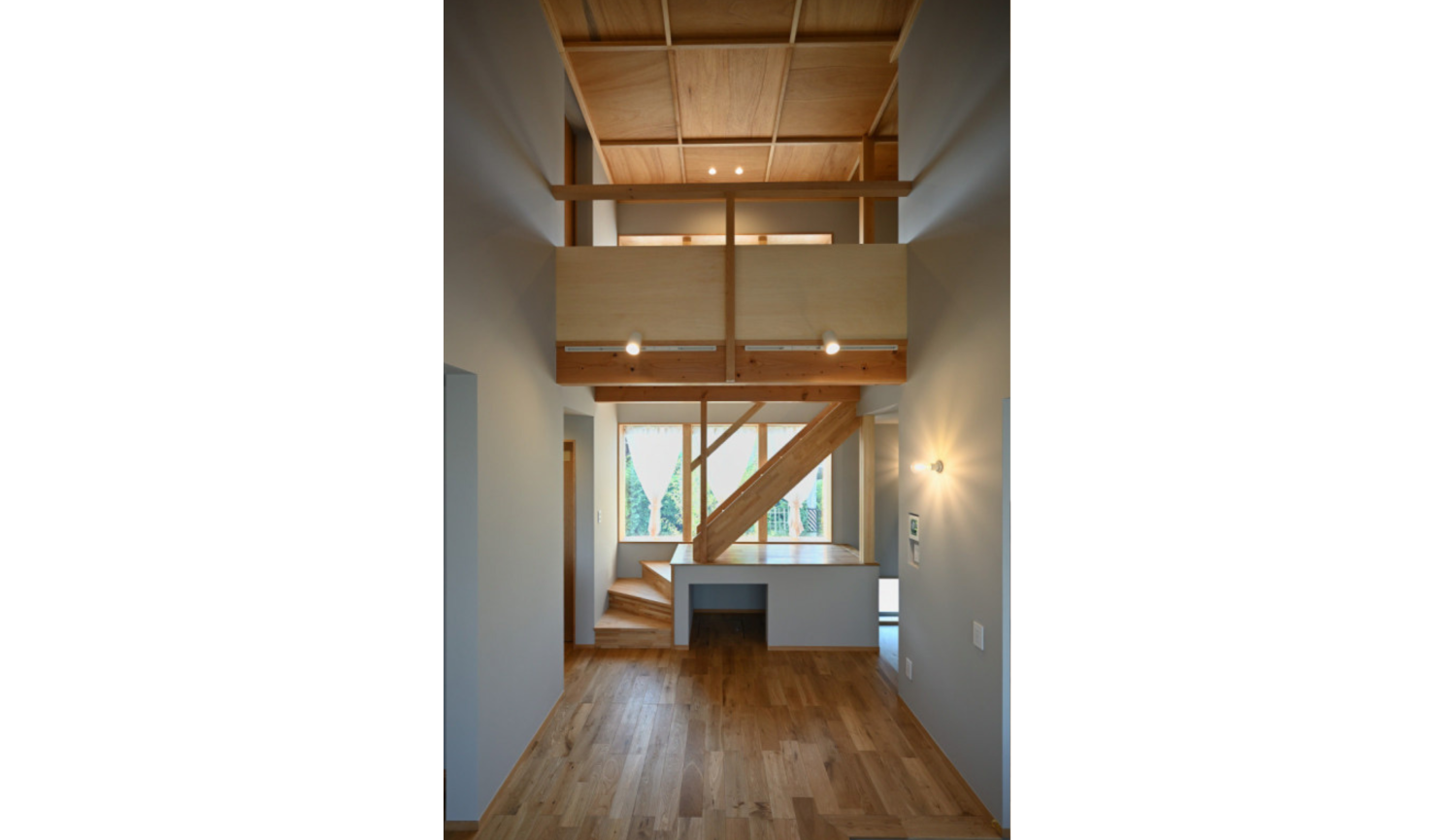 一般的には南向きの窓が好まれますが、この住宅では敷地の形状や周囲の環境を考慮し、北向きに大型の窓を設けました。北側の窓は一年を通じて安定した光を取り入れることができ、家の内部に心地よい明るさをもたらします。また、通りに面しているため、木の温もりと風合いを感じる大きな木製窓は行き交う人々の注目を集めています。