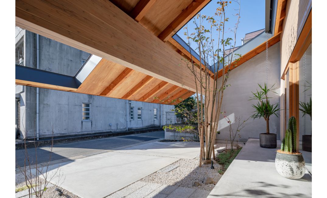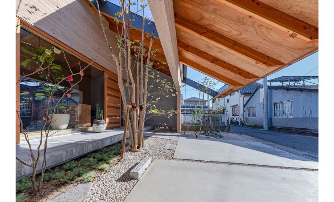 1階に設けた大きな開口部は、駐車スペースと前庭がクッションになり外部に対して生活がむき出しにはなりません。さらにそこに大屋根をかけることによって、半戸外のような空間となり住居と道路を緩やかにつないでくれます。ただの外ではなく室内の延長として暮らしの中で使える場所になりました。