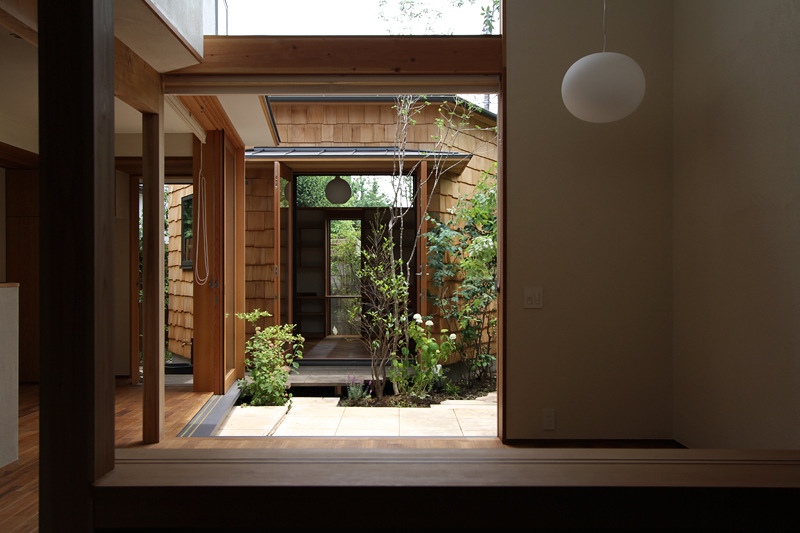 外壁は、レッドシダーの薄い板を重ね合わせるように並べたシングル葺きを採用。レッドシダーの質感が外観に豊かな表情を与え、中庭の景観と調和します。