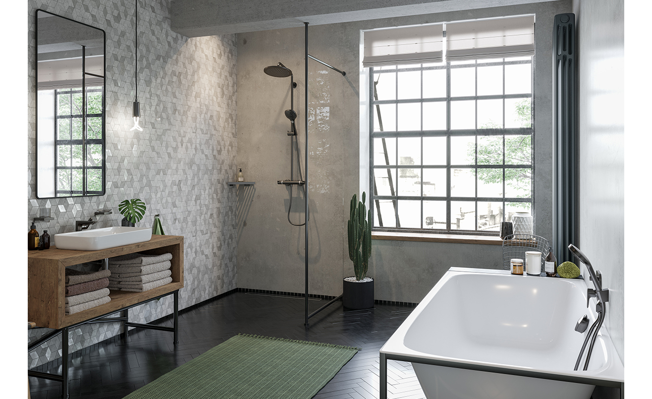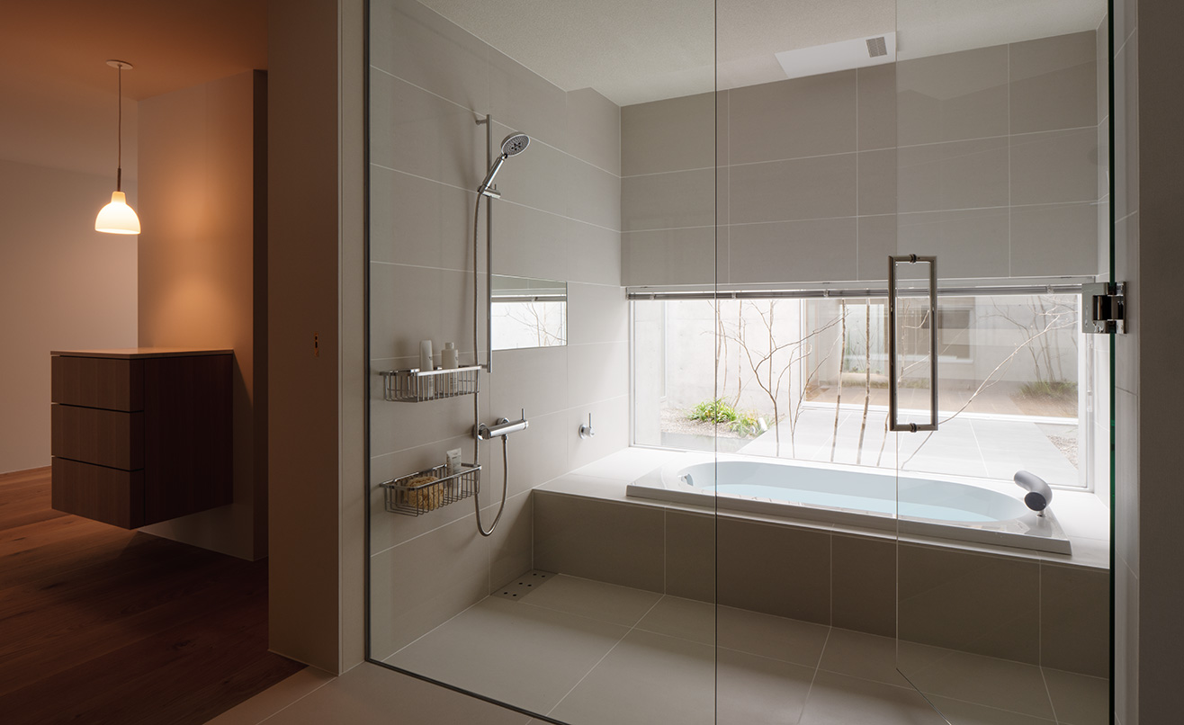 通常、ユニットバスは全面の窓にすることができないため、船などで使用されるFRP防水材を床と壁に採用しました。防水した床の上に、置き型の浴槽を置いた作りです。