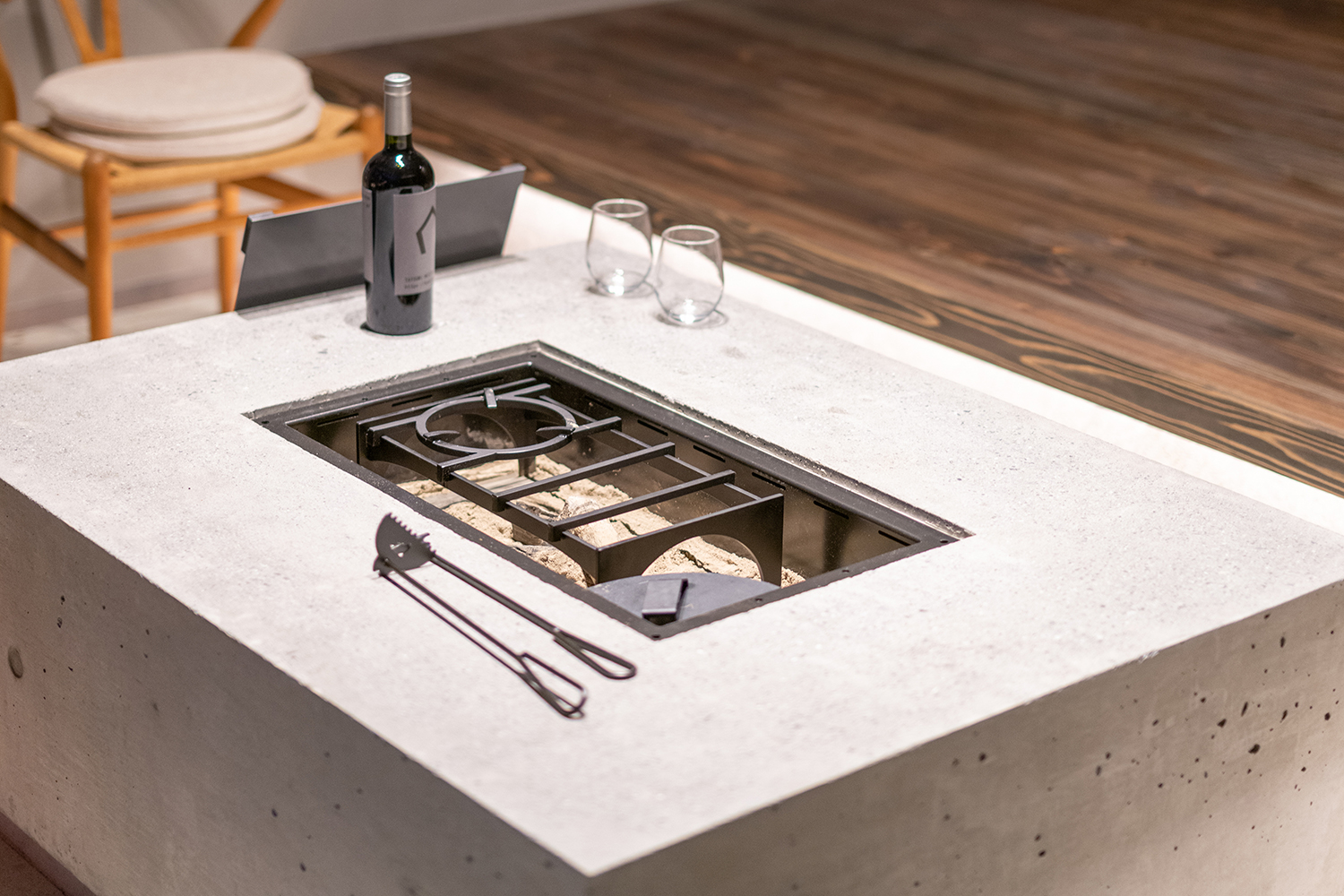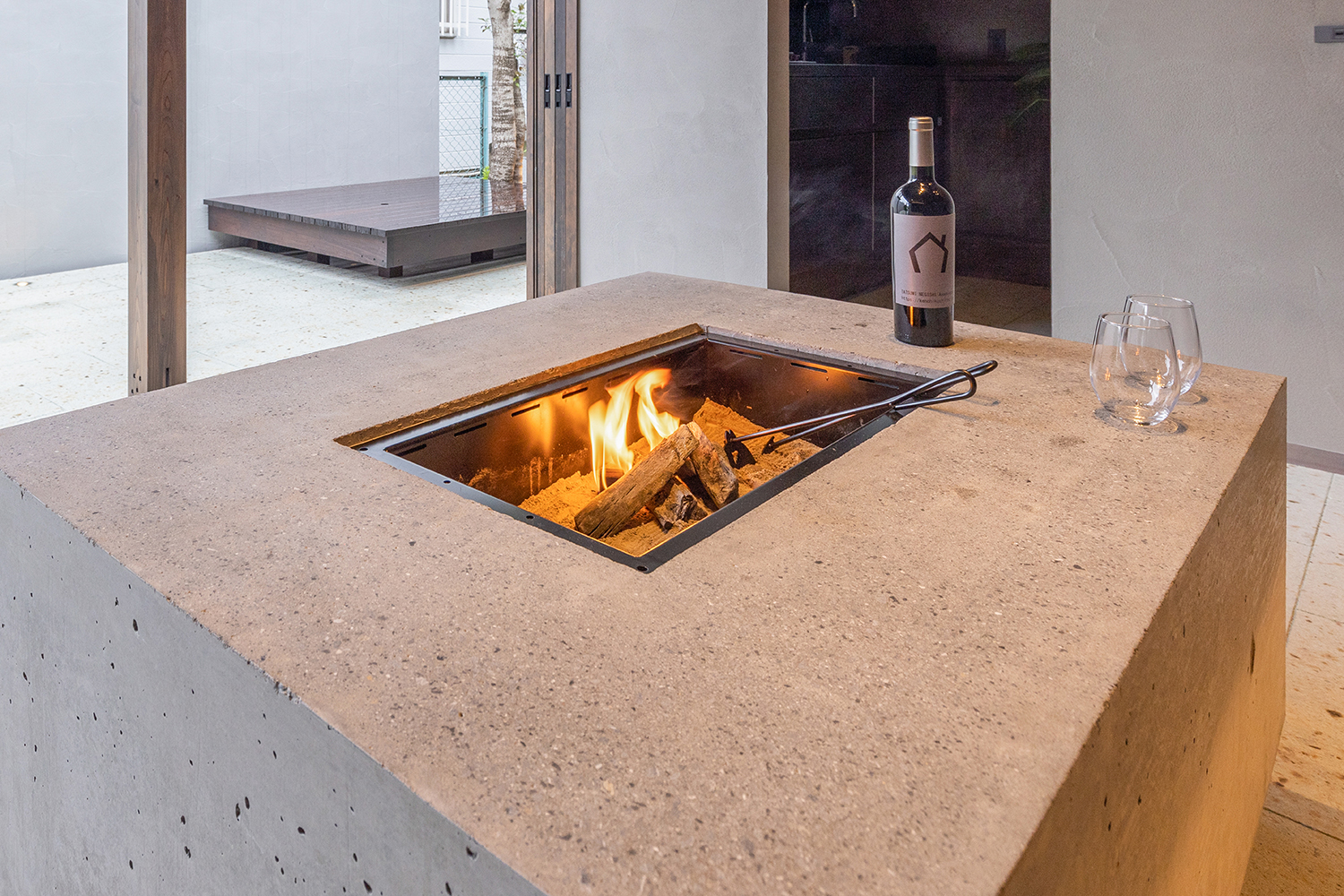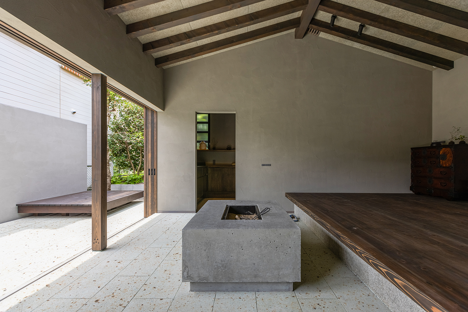 囲炉裏はコンクリートで造作し、昔ながらの家具が置かれた空間に、コンクリートの少しモダンなテイストを加えることで全体の調和が生まれます。