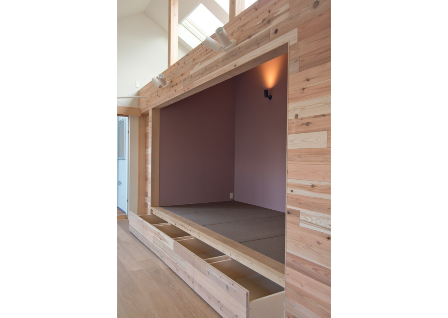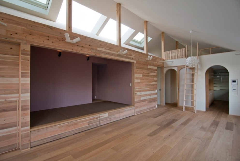 リビングには小上がりになったモダンな和室を設けました。休憩スペースやお子様が里帰りされたときの寝床にもなり、奥には仏壇が置け、仏間にもなります。床下には大きな収納スペースが確保され、空間を無駄なく有効活用しています。
