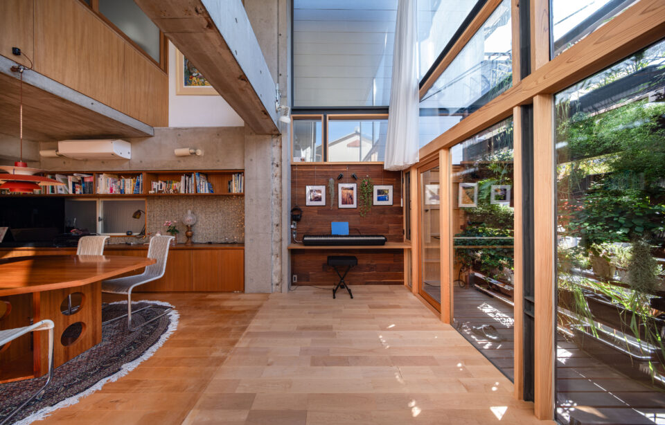 今回ご紹介するT邸も都市部にある住宅の改修です。このお住まいはもともとインナーバルコニーと大きな窓を備えてはいたのですが、向かい側にマンションがあり、視線を避けるためにカーテンを閉め切って生活している状態でした。目隠しの乳白色のポリカーボネートの壁はあるものの、人影が透けてしまうので少し心許ないと感じました。