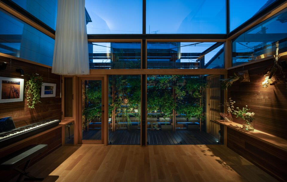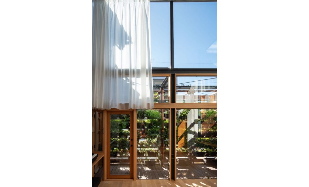 そこでインナーバルコニーの一部を室内化し、よりプライベート感を高めるとともに新たなファサードとして鉢植えを置ける棚状の緑化壁を設けました。壁を作るというと空間を閉じるように感じられるかもしれませんが、緑化棚にすることで、外からの視線は遮りながら屋内からは植物と空が見え、より広がりを感じられるようになりました。