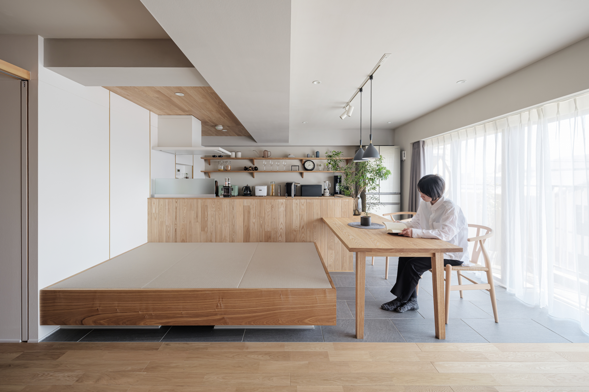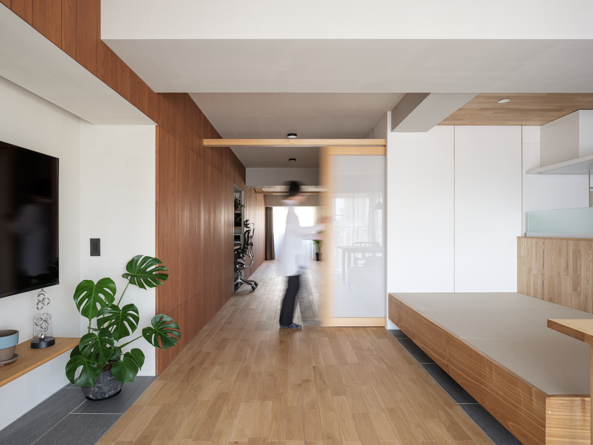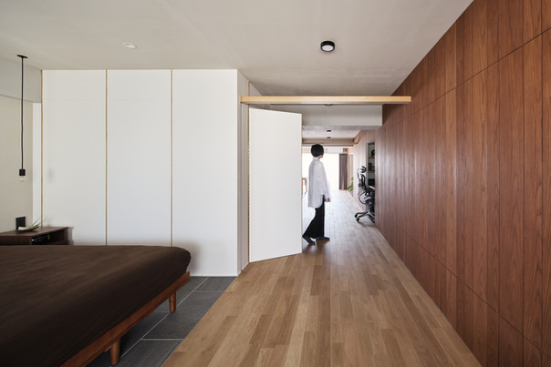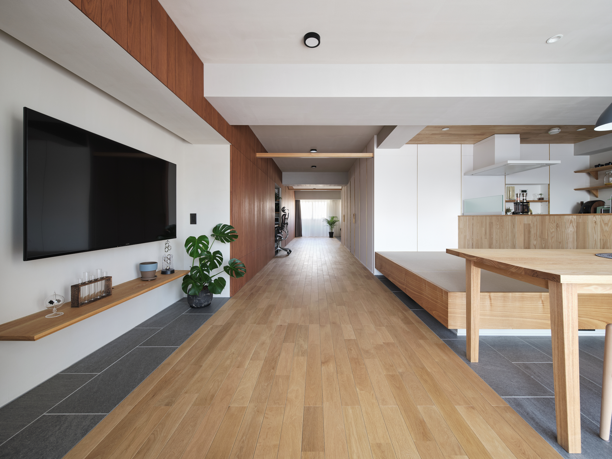 また『通り部屋』はフレキシブルに使える生活空間です。ワークスペースも備えており、木目の壁面は一面収納になっています。反対側の白い箱状になった壁の中には水回りをすべて収め、それらへの動線としての役割も担っています。