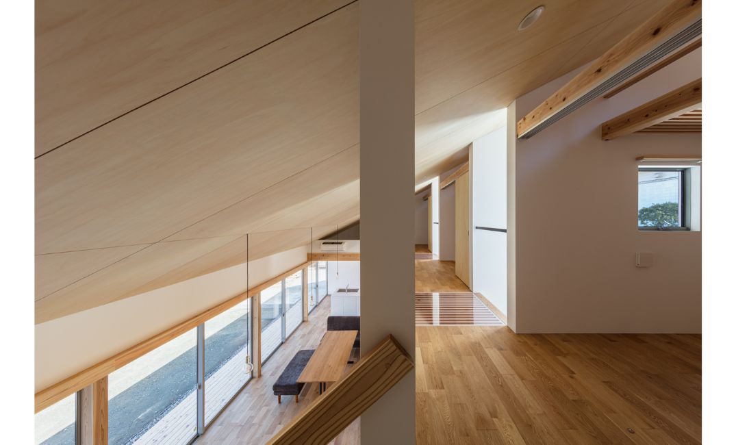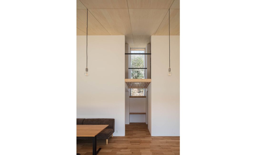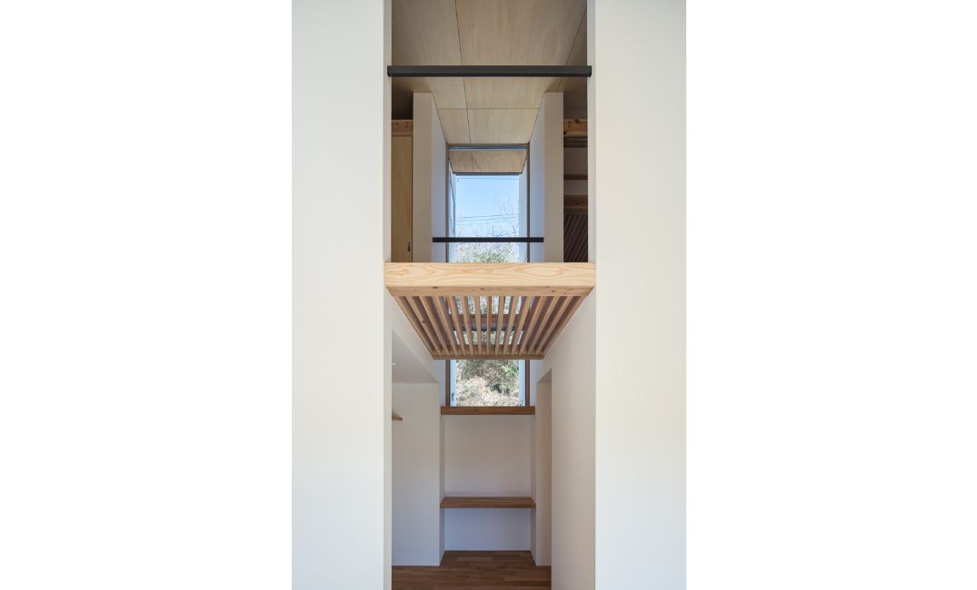 そこで改めてその美しさを非日常として体験してほしいと思い、縦で切り取ってリビングから絵画のように楽しめる窓を設計しました。東側には道路があるため外部の人の気配を避けて自然だけを切り取れるよう、外からの視線をかわした高さから天井際までの長方形になっています。2階部分の通路も視界や光を遮らず景色がリビングに届くように、木製の格子とアクリルで作成した透過する床としています。