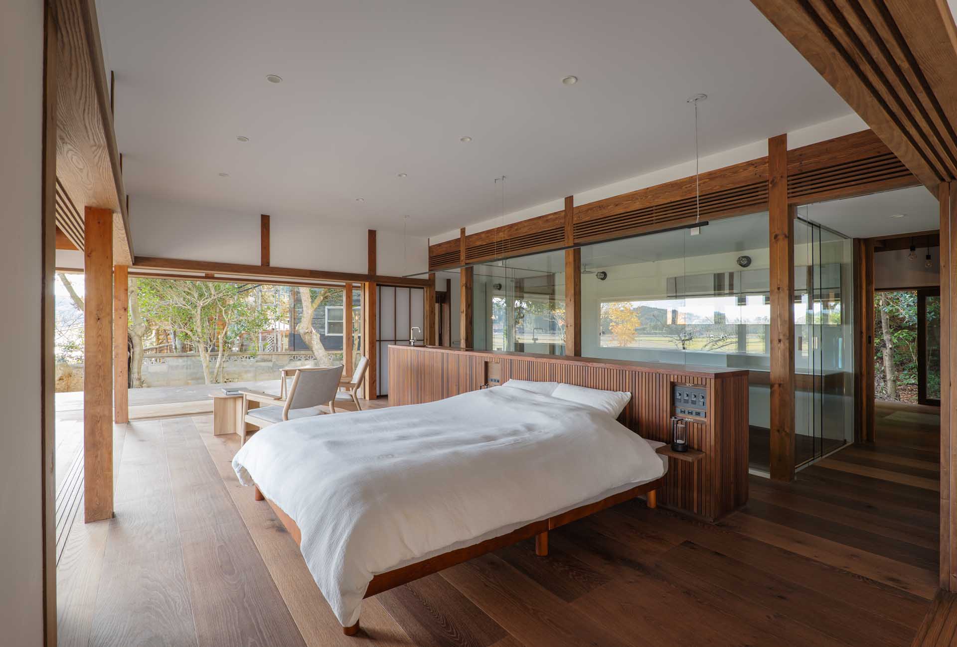 ガラス張りですが周囲の田畑から上がった擁壁上にあるため、外部からの視線も気になりません。(それでも少し抵抗感があるな、という方はベッドルームの障子で視線を遮ることができます。)