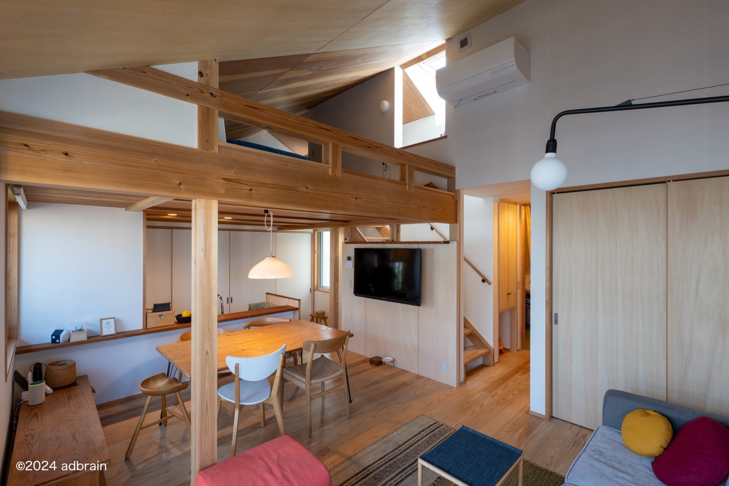 また、会話が多い場所では天井が少し低く籠り感がある方が落ち着き、安心感をもたらすという考えから、2階にロフトを設け、ロフト下にあたるダイニングの天井を少し低くするよう設計しました。この工夫により、ロフトスペースも確保でき、リビングに広がる吹き抜けの空間でより一層の開放感を感じさせます。