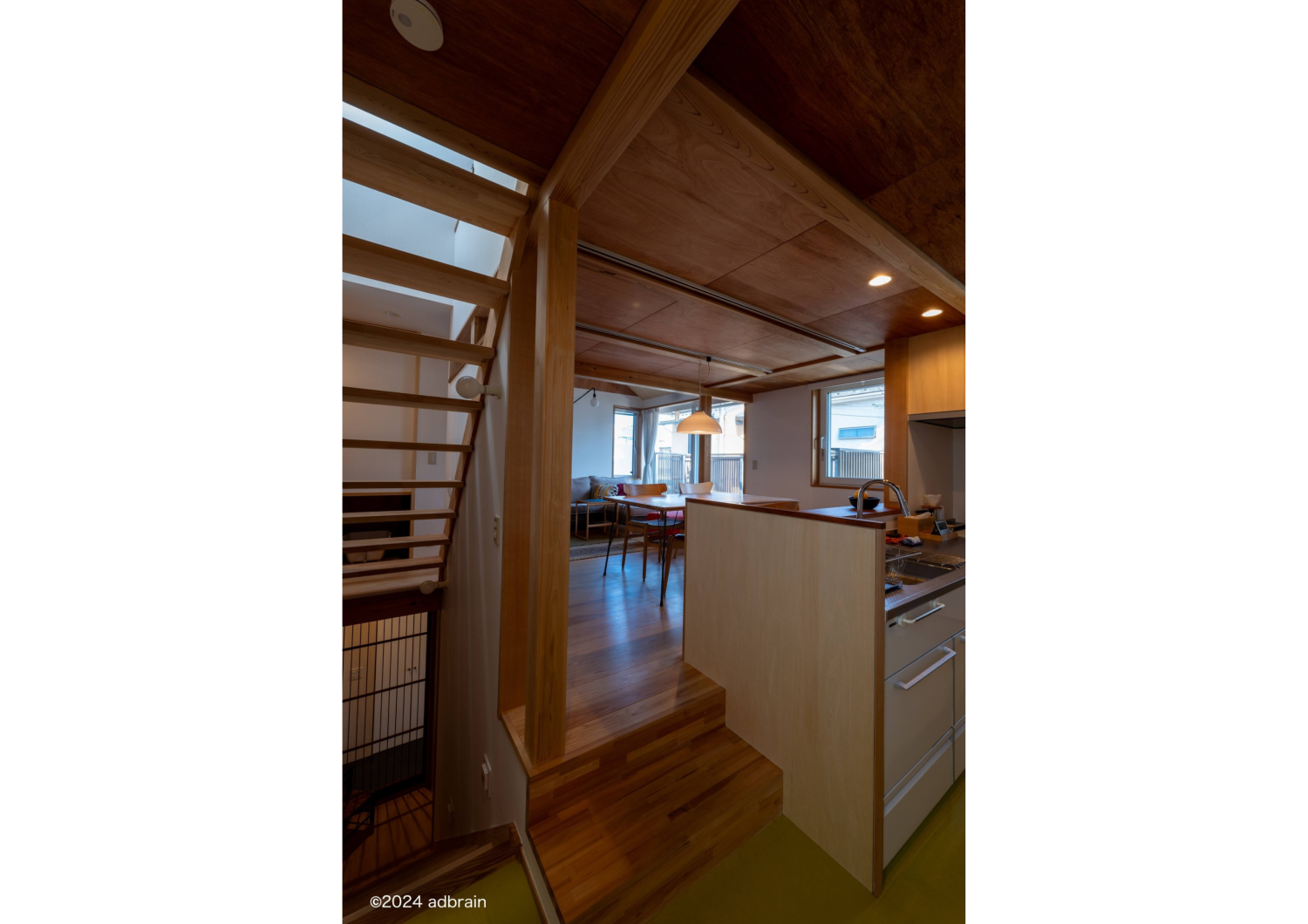 キッチンカウンターの床を30センチ下げることで、ダイニングテーブルとカウンタートップの高さを揃えました。これにより、キッチンで作業する人とダイニングに座る人の視線が自然と合い、会話がしやすくなります。