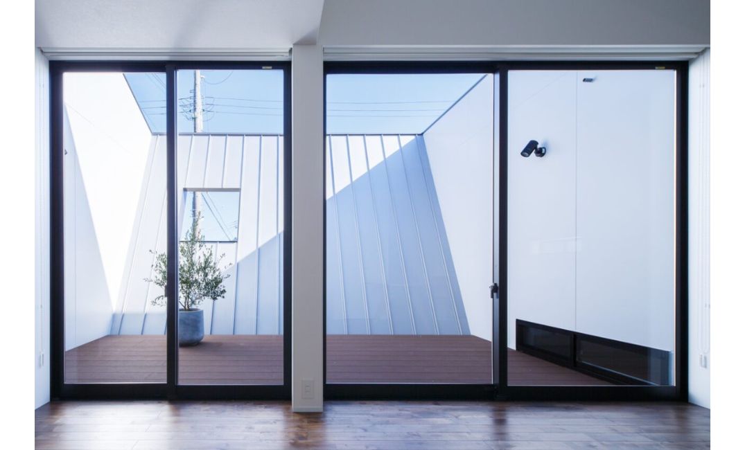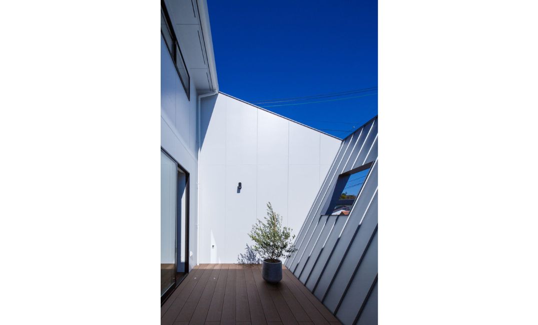 壁の内側は白を採用し、光の反射でレフ板のように室内をより明るく照らし、壁が閉塞感を与えないように意図しました。素材も表裏ともに屋根材を採用し、傾きがあっても汚れが流れやすいよう設計しています。上方が大きく開くことで内部からの視線も空へ抜け、プライバシーを守りながらも床面積以上の広がりを体感できる空間となりました。