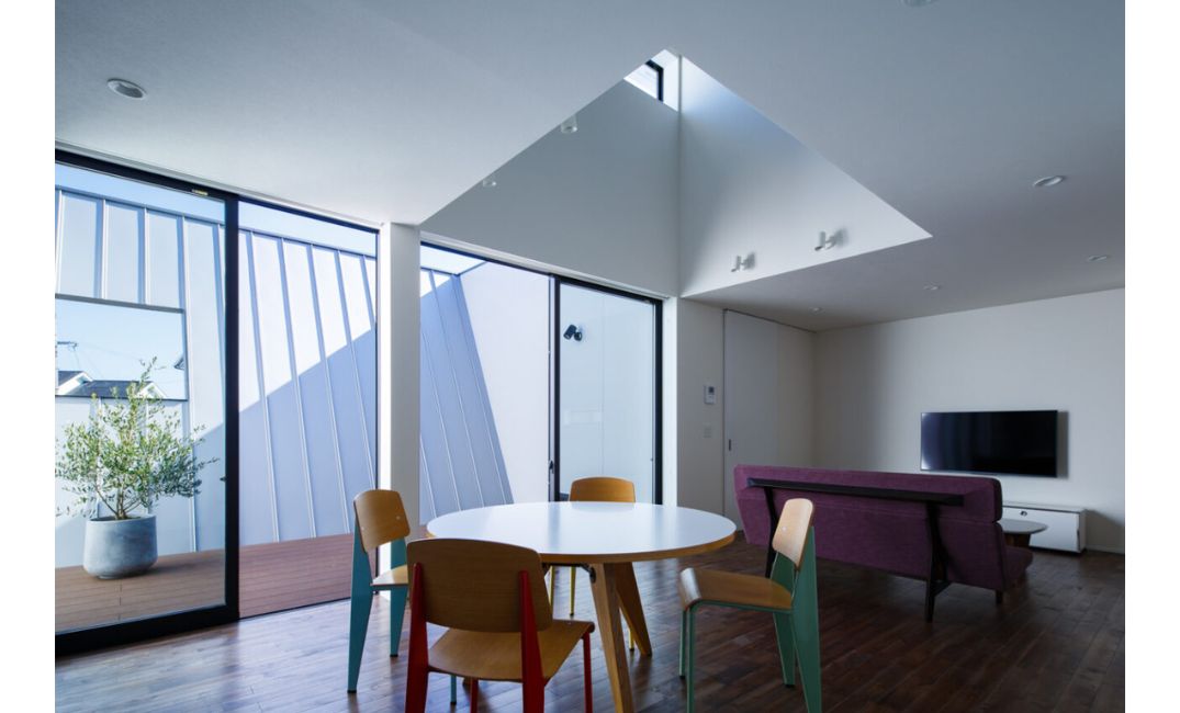 東側をメインの採光にすると述べましたが、道路に面しているのでそのまま開くと生活が外に対してむき出しになってしまいます。そこで、東側に中庭を設けること、そして中庭を囲む壁は外へ向けて傾けることで、外部からの視線は遮りつつ、より多くの光を採り込める形としました。
