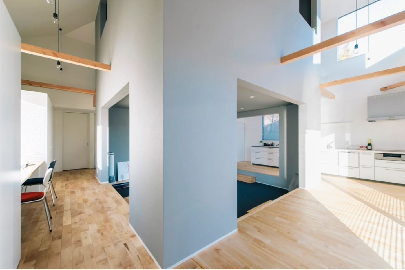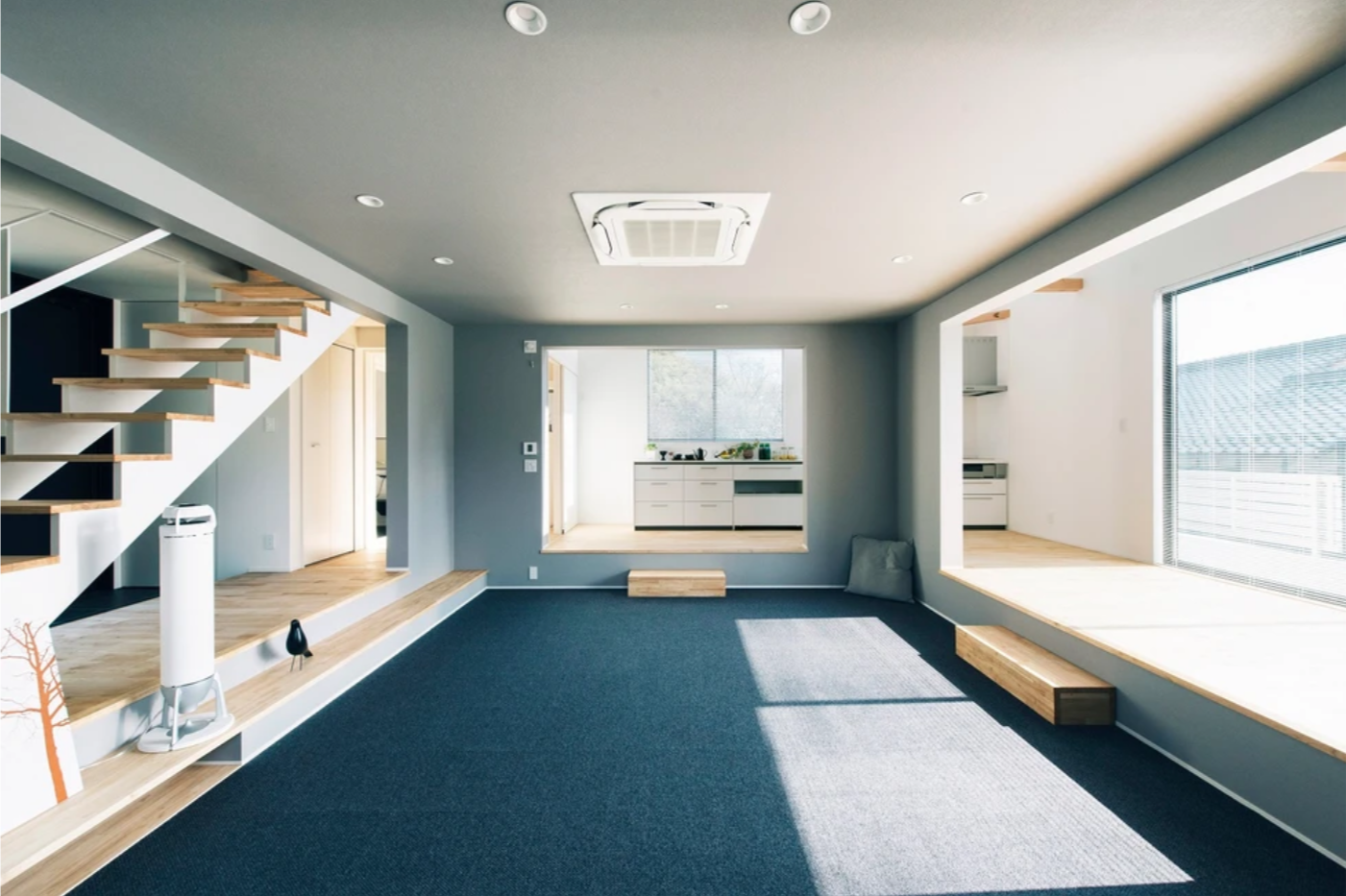 たくさんの友人を招いてボードゲームを楽しむ為、家の中心に広場のようなリビングを配置。上り口にある踏み台は集めてつなげるとボードゲーム用の机にもなります。 リビングを囲むように回遊性を持たせてつくった回廊スペースは、音楽の演奏のステージにも変身。一段下がったスペースを客席にして自宅でミニコンサートを開けるよう設計しました。