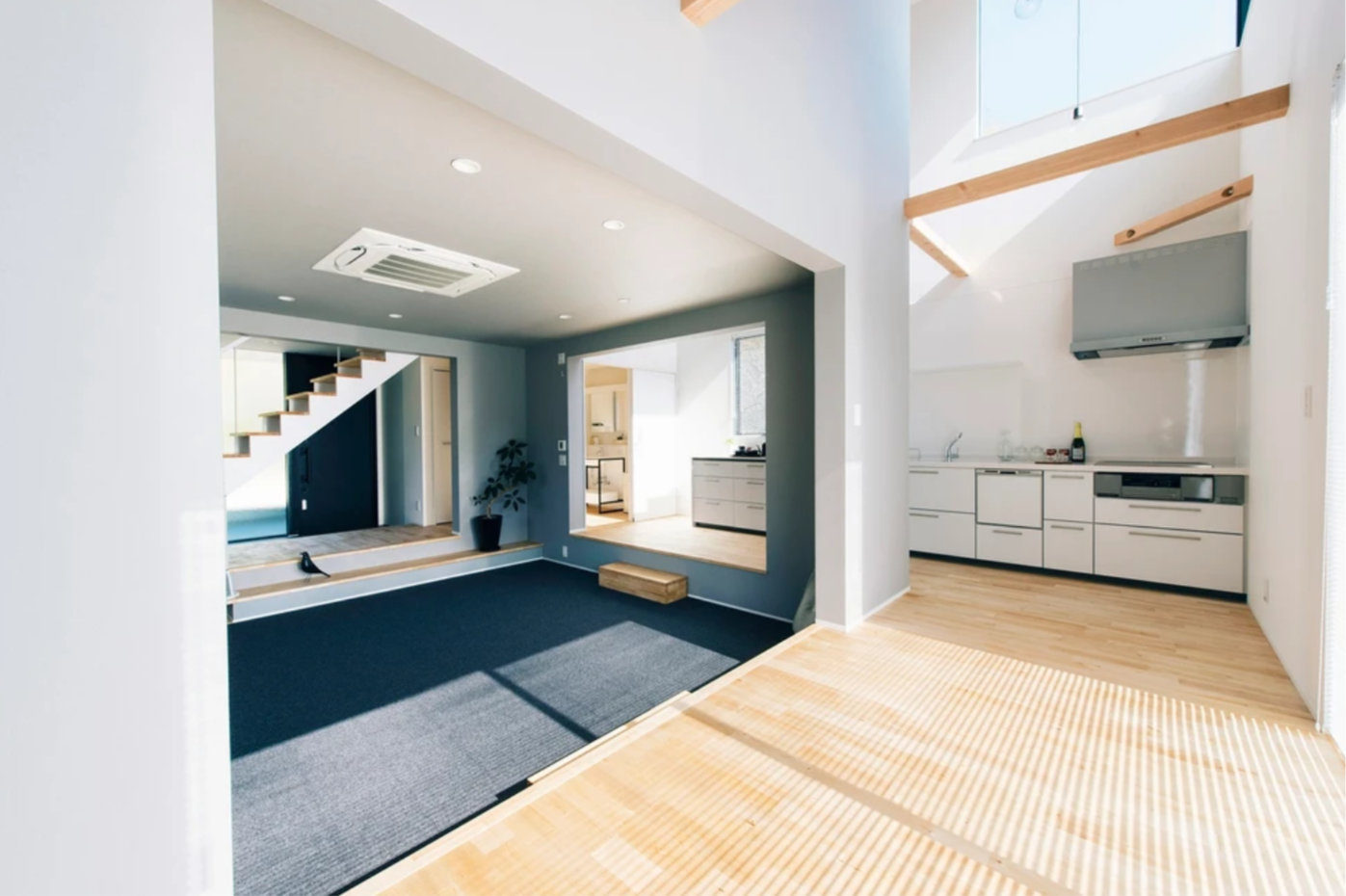 一段下がったリビングスペースは、キッチンからも様子が良く見えるので、子育て中も安心して家事ができます。タイルカーペットは、汚れると部分的に交換できるのも嬉しいポイントです。