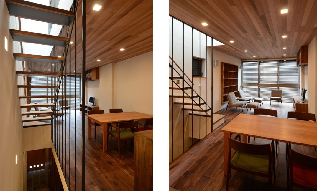 その中でも特徴的なのが、外部に面した窓に設置した木製の外付けルーバーです。目線を避けながらも風は通り、直射ではないですが自然光を感じられます。可動ですので、景色を見たいという時には開けて、外とつながることもできます。また、可動ルーバーに鍵はかかっていないので、消防の出入りなど緊急時の対応の要件も満たしています。木製なので経年である程度のメンテナンスが必要ですが、落下などはしないように安全対策は確実に行っています。