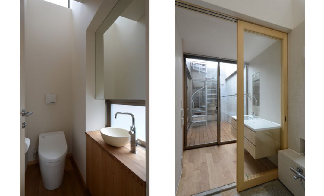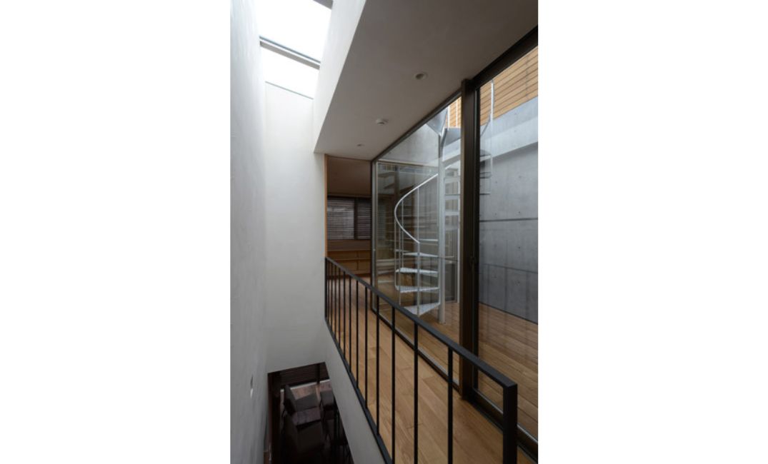 加えて、外部の視線が気にならない屋上に設けたトップライトやインナーテラスを通して上部からも光を採りんでいます。採りこんだ自然光をスケルトン階段で下階にも行き渡らせ、明るい室内空間を実現しました。