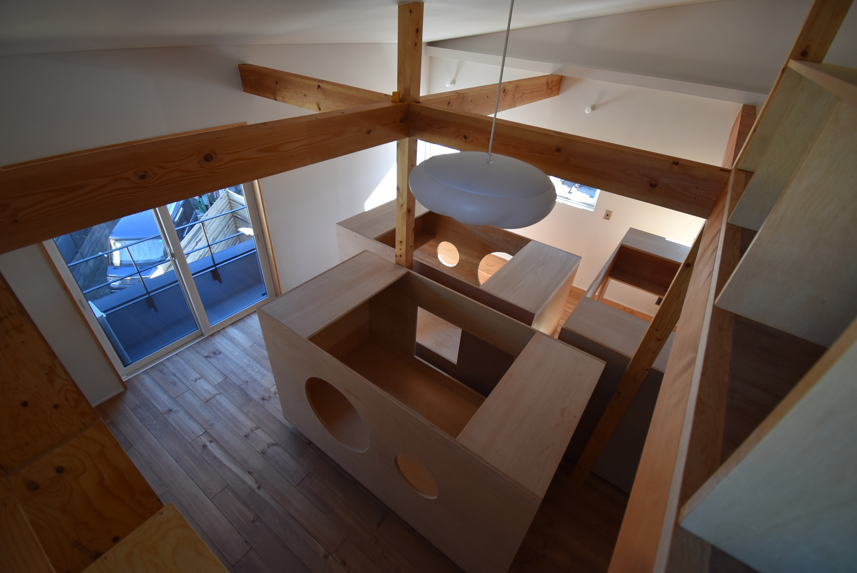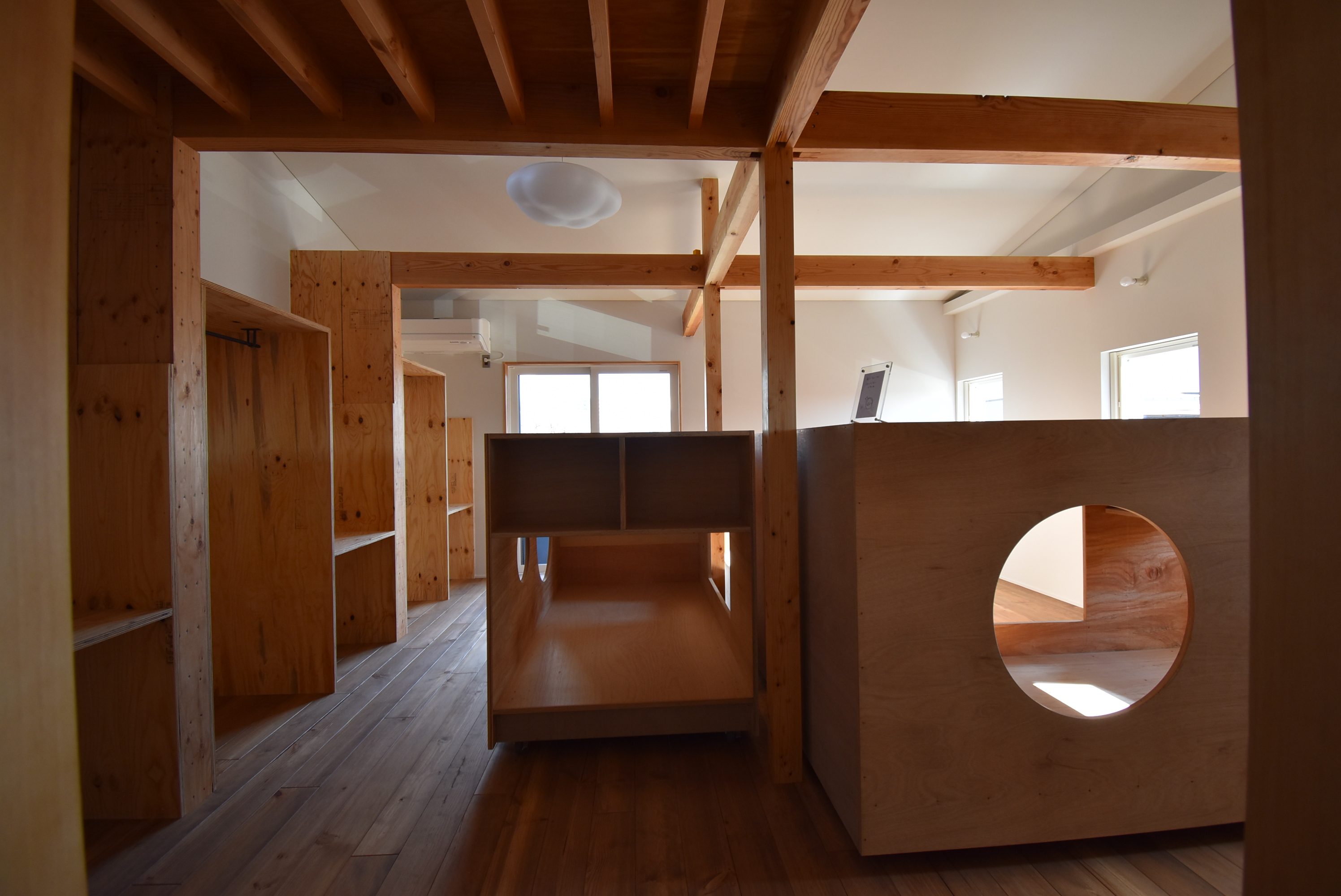 その特徴がよく表れているのが大きな3つのハコを設置した子供部屋です。ハコは移動可能なベッドであり、間仕切りでもあり、1つずつが収納も備えたそれぞれの子のテリトリーです。3人の部屋を分けると面積的にも余裕がなくなり、寝るだけの空間になってしまいます。そこで、自分の領域はハコで確保しながら大きな一つの空間の中で過ごせるように配置し、将来、間仕切りが欲しくなったときにはハコを移動させて自分たちで使いたいように空間を分けられるようにしました。