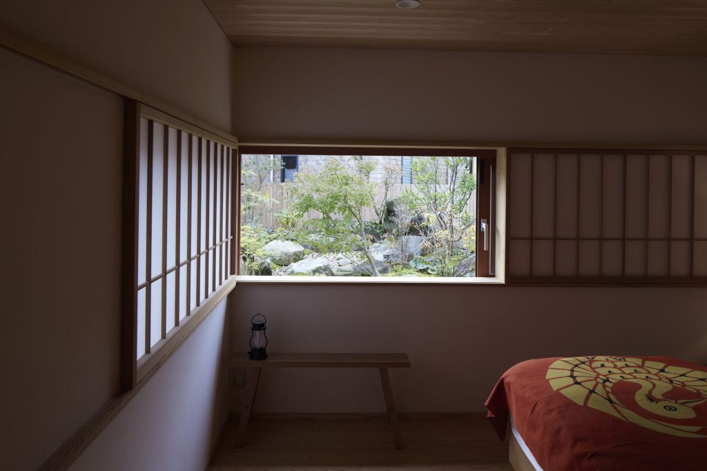 中庭は、家のどの場所からも美しく見えるように設計しました。例えば、寝室や廊下、書斎空間、和室などからそれぞれ異なる視点で庭を楽しむことができ、同じ庭でも違う印象を与えます。この工夫により、その時の気分や季節や時間帯に合わせて過ごす部屋を選ぶ楽しみも生まれます。