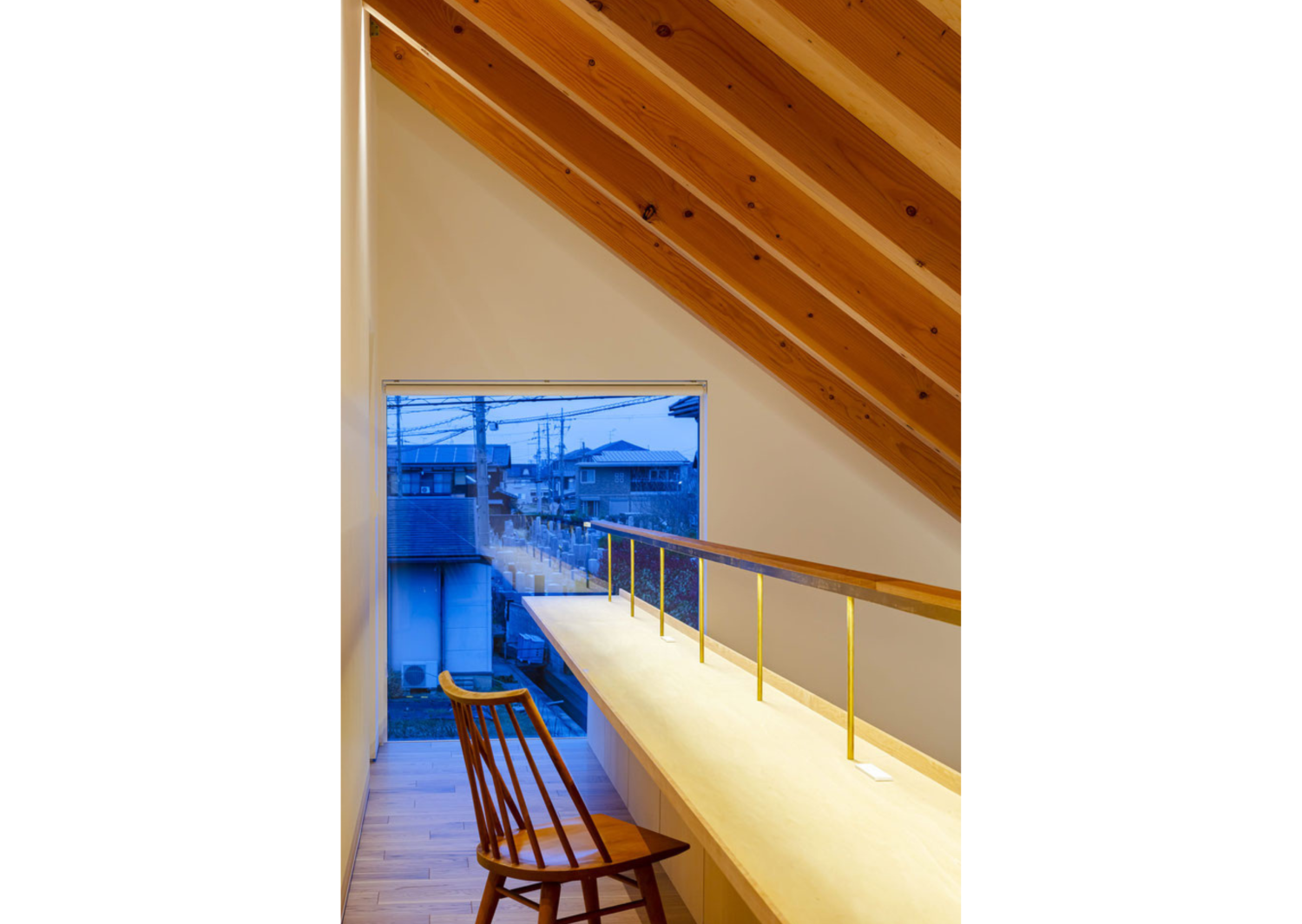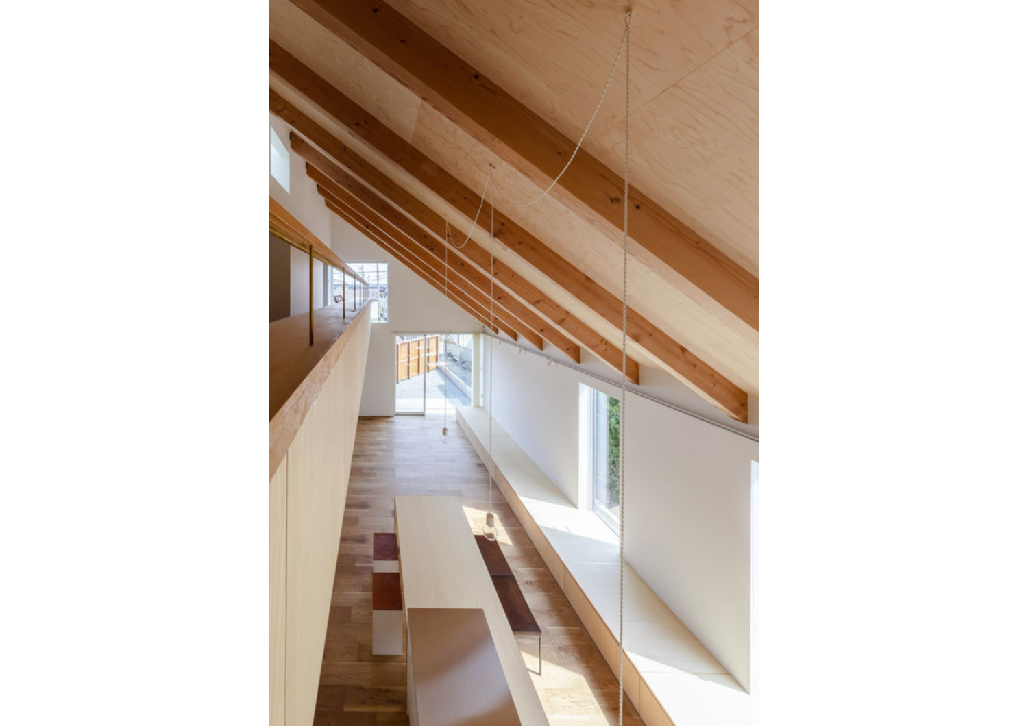 吹き抜けでつながる2階の空間には、1階のベンチに平行して長いテーブルを設置しています。これにより、つながりながらも適度な距離感を持つこともでき、ちょっと読書をしたり、子どもたちは勉強したりと家族のライフスタイルに合わせて使用できます。