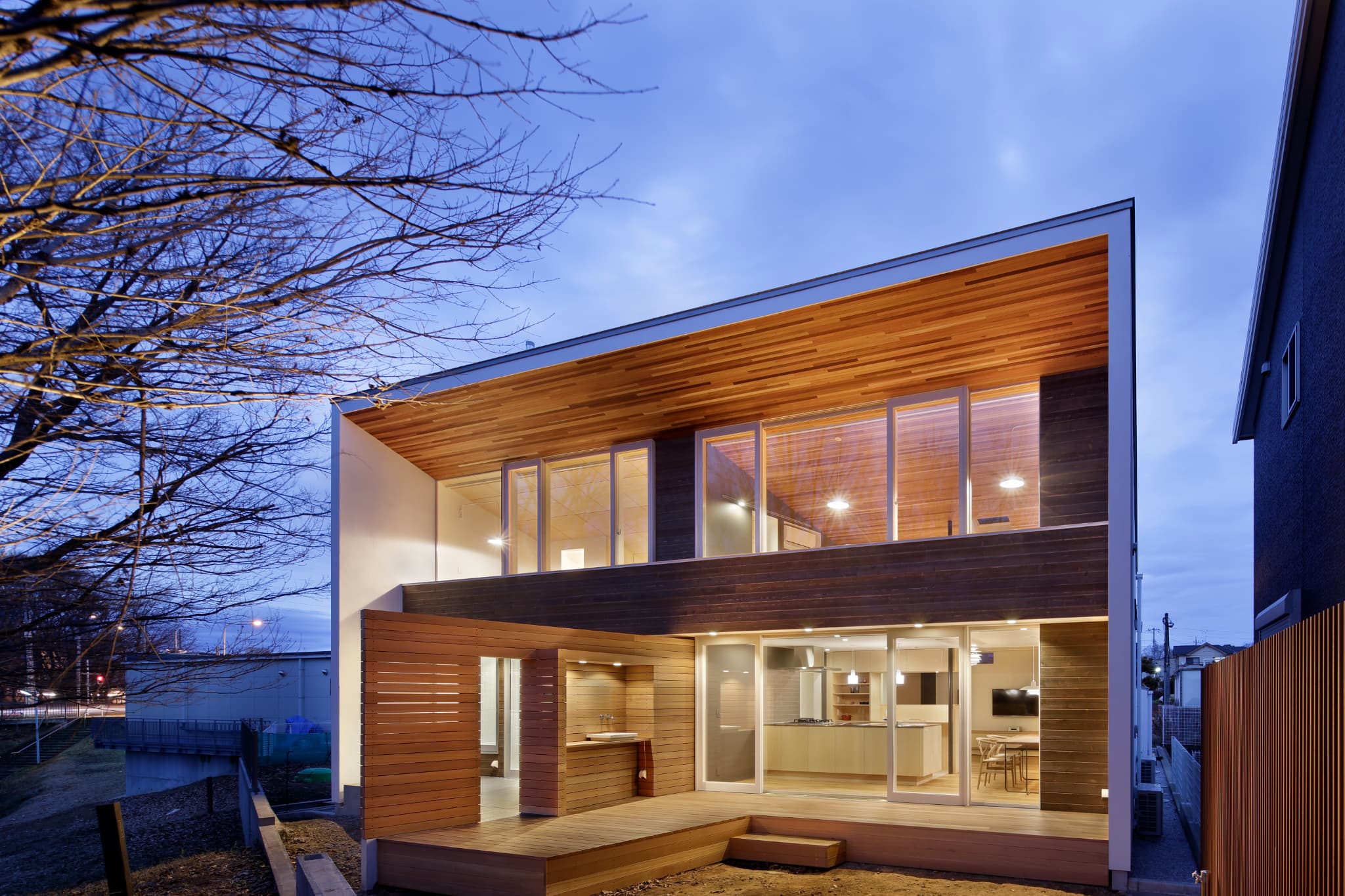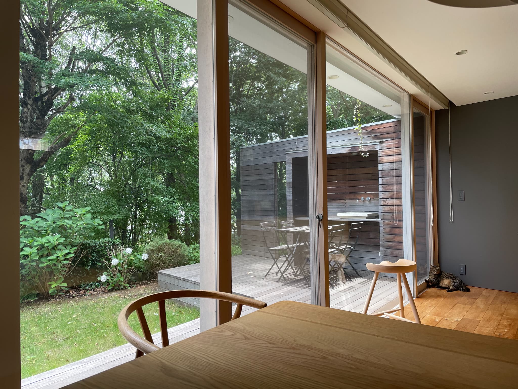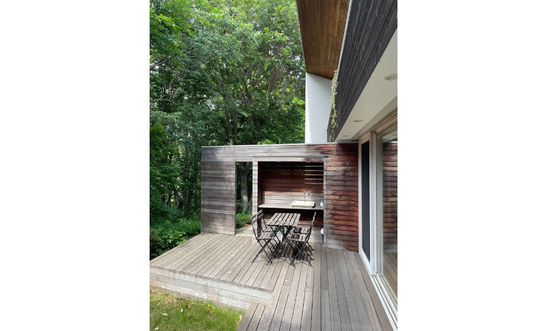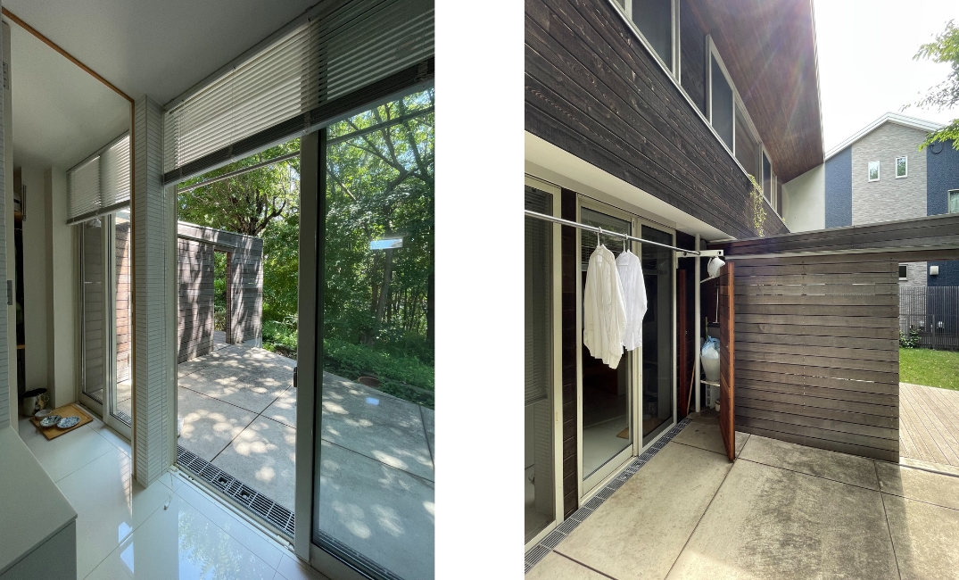 『G邸』もそのような考え方の下、壁を境に室内をパブリックゾーンとプライベートゾーンに分け、加えて、庭も壁と連続性のある木フェンスで『愛でる庭』と『生活する庭』に分けました。これによりパブリックゾーンであるリビングには庭とその先に広がる森の景色だけが採りこめます。そして反対側の庭には来客時でも気兼ねなく洗濯物を干せ、掃除用具を収納したり、ごみの一時置きをしたりと生活に必要な家事が心置きなく行えます。