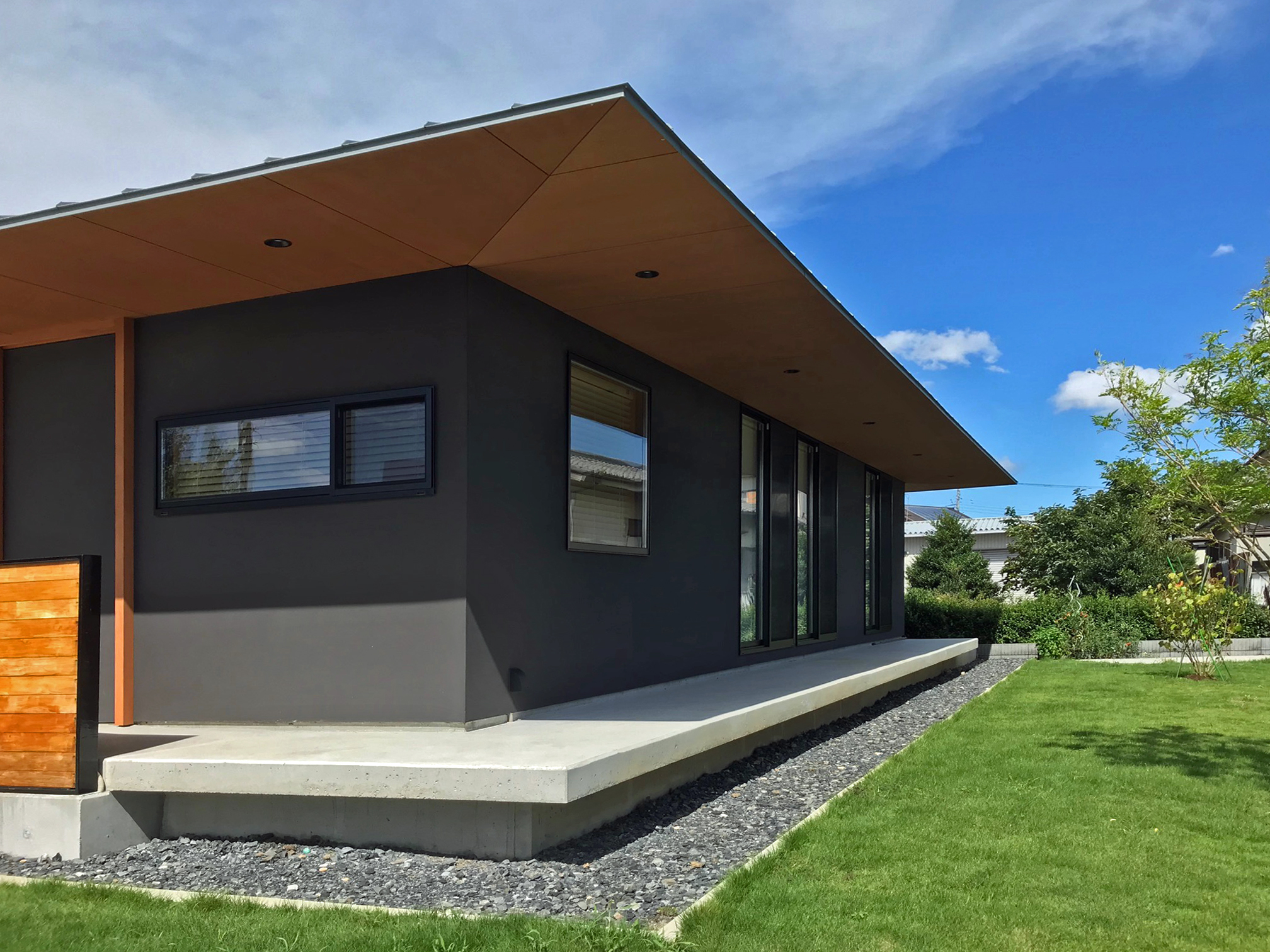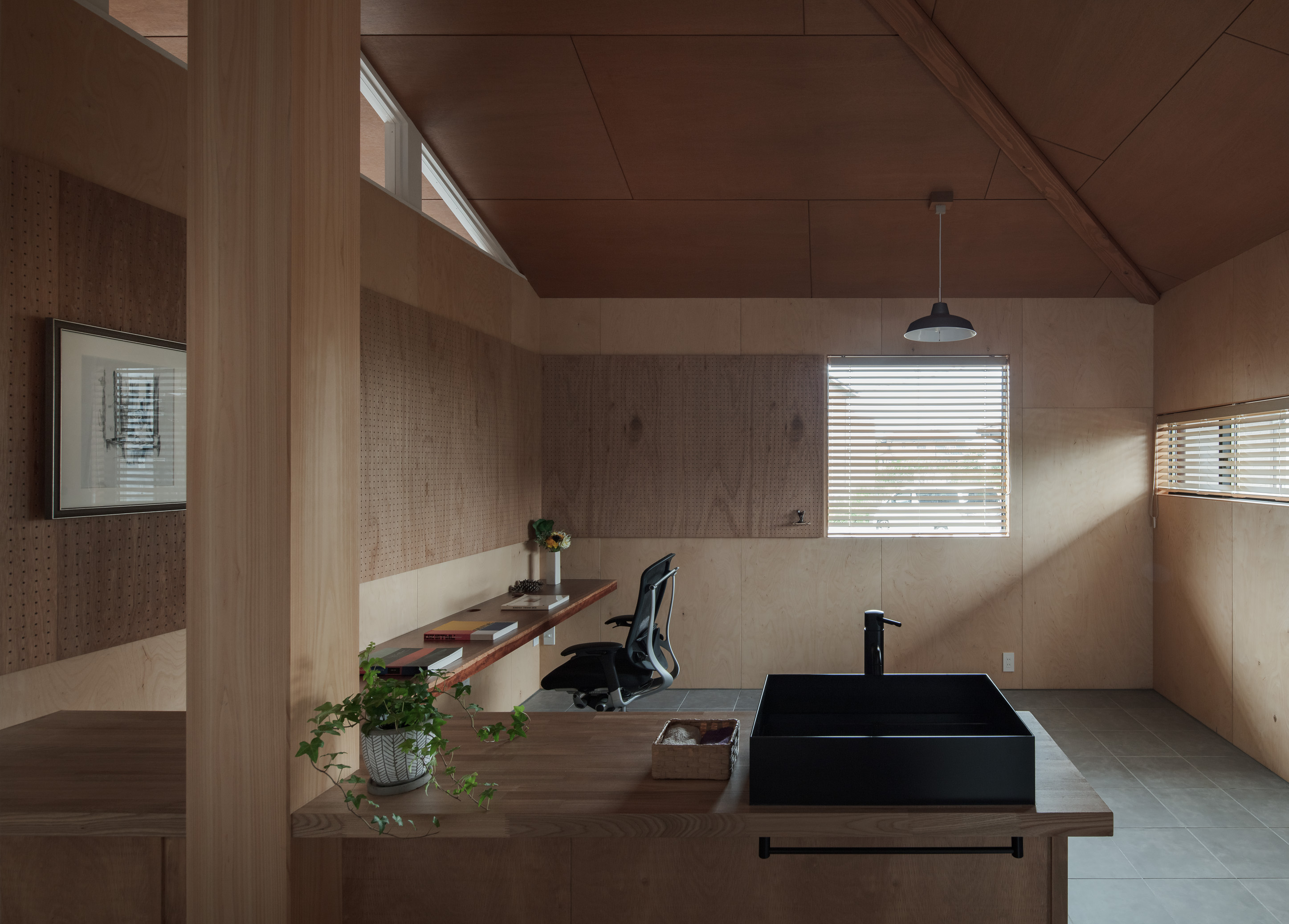 自邸『歪・方形屋根の家』では多目的の土間スペースを設けました。当初は、主に設計の打ち合わせなどを行う客間的な来客用スペースとして活用することを考えていました。ところが玄関入ってすぐの土間はかなり使い勝手がよく、客間だけでなく、家族が様々な用途で活用することになりました。コロナ禍という状況で、子供たちもお互いの家の中に上がって集まるのが難しくなったときには、外の延長のような玄関先のこの土間で友達と遊んだりもしていました。玄関には手洗い場も設置していたので、来客もこの場で必要なことが完結できます。清掃もしやすい土間なので、サッカーなどで汚れて帰った時もこの土間と手洗い場で落とすことができ便利です。このような用途を限定しない土間スペースがあると、面積以上に空間を有効活用することができおすすめです。