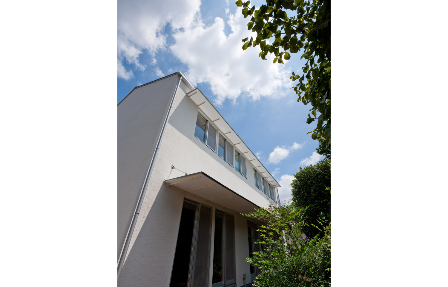 見た目にも清潔感のある白の外観は、爽やかさの中に左官仕上げならではの手作業の温かさを感じるテクスチャーです。反射色と断熱材を効果的に使うことで、冬の断熱性能と夏の遮熱を兼ね備える住宅となりました。