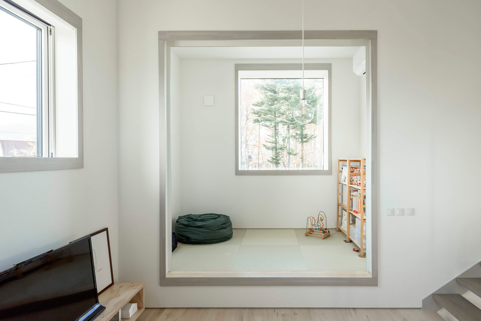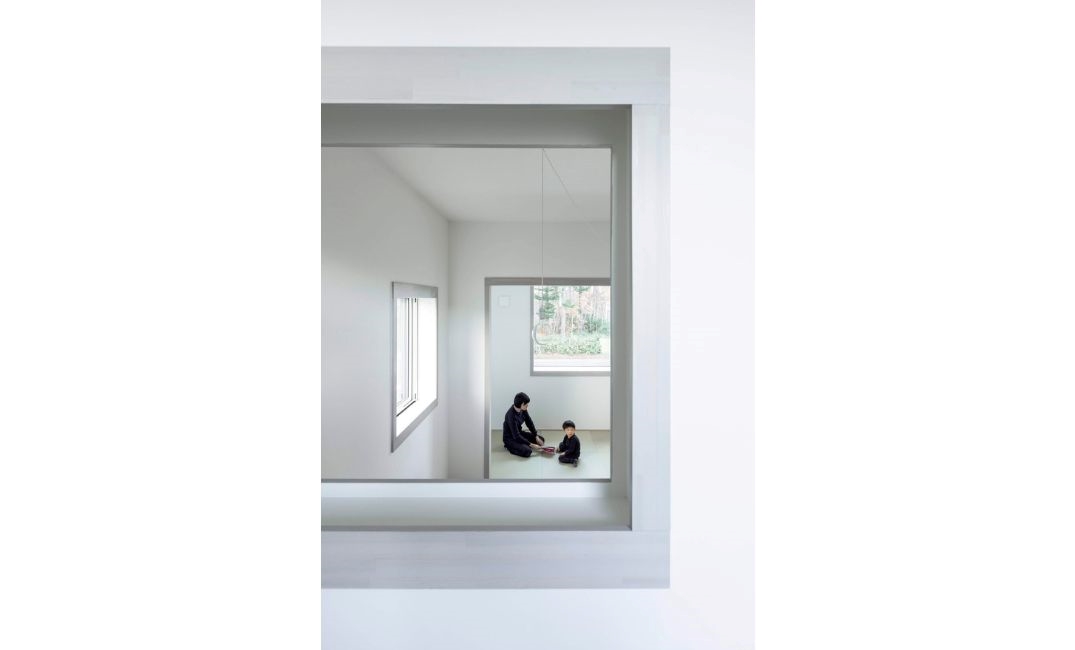 さらに室内の開口部は外部へ向けた窓と統一したデザインのフレームで囲み、外の景色を室内に採りこむ窓、室内の景色をさらに室内で採りこむ窓として、空間同士をつなぐ同じものとして存在させました。