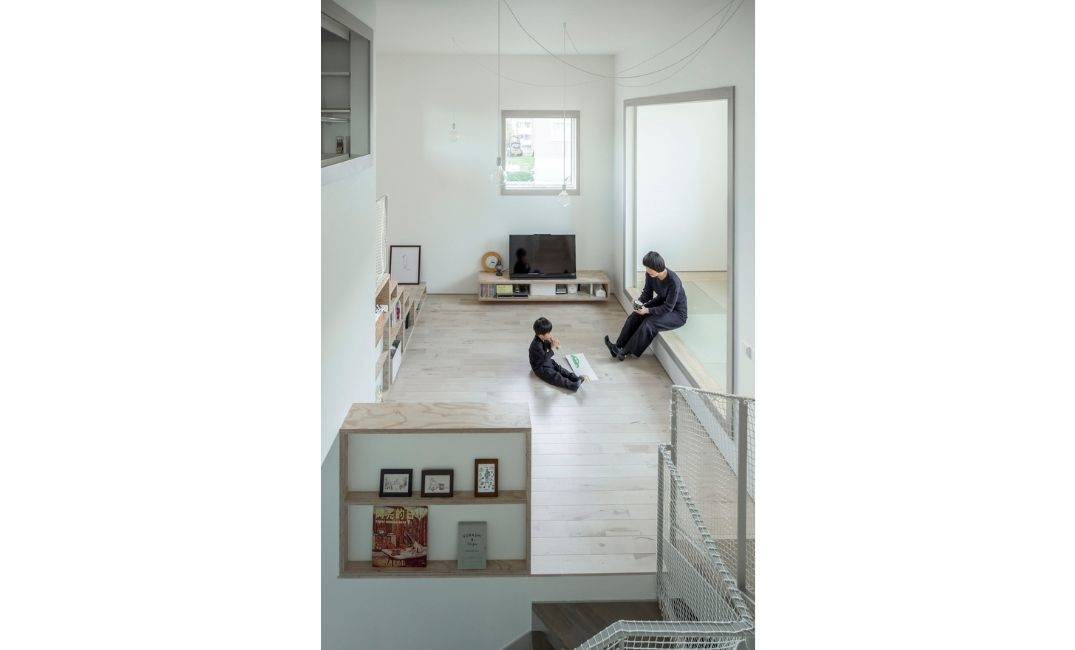 それぞれのフロアは適度に囲まれ視線を躱しつつも、壁で行き止まりではなく開口の先に別フロアが臨めます。開口越しの別フロアが借景のような効果をもち実面積以上の広がりを感じられるように意図しました。