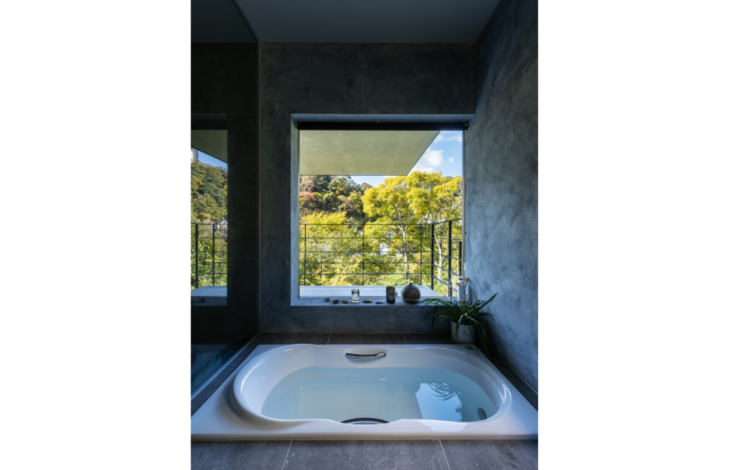 外の庇は深く、3.4メートルほどあるため、通常の設計では浴室の窓からの景色が庇に隠れてしまいます。そこで、お風呂を床面に設け、方形の大きな窓をかなり低い位置に配置することで、広がる景色を存分に楽しめるように設計しました。夜にはテラスからのスポットライトが緑を照らし、昼とはまた違った雰囲気を楽しむことができます。