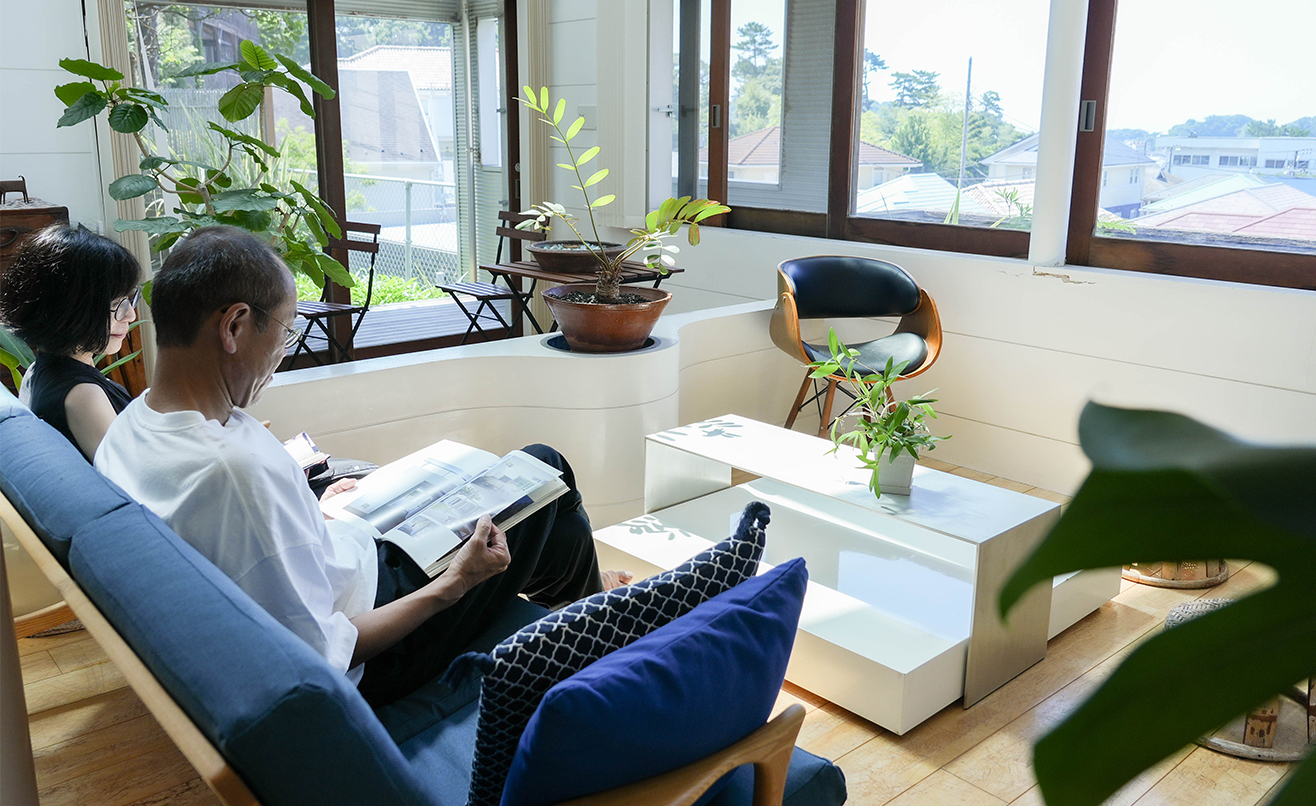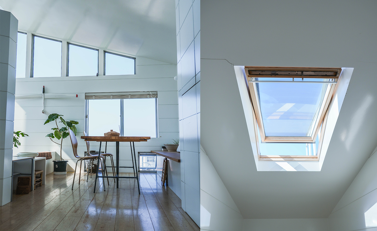 天窓は、外からの光を取り込む明かり採りとしての要素が強いと思われがちですが、特に夏の暑い時期に滞留した暑い空気を外に逃がさせるサーキュレーターとしての役割にもその効果を発揮してくれます。実際、腰越の家には2つの天窓がありますが、1つは暗い階段室に光を呼び込む目的として。もう1つは、リビングのサーキュレーター効果を目的とした、異なる効果を見込んだ天窓を2か所設置しました。この令和の時代にエアコンにあまり頼らず生活するというのは極端な事例に感じる方もいるかもしれません(笑)。それでも室内にいながら「気持ちいい風だな」と感じて過ごせるほどの効果が天窓にはあります。そういった製品のポテンシャルを引き出すのも、建築家として設計の腕の見せ所かもしれません。
