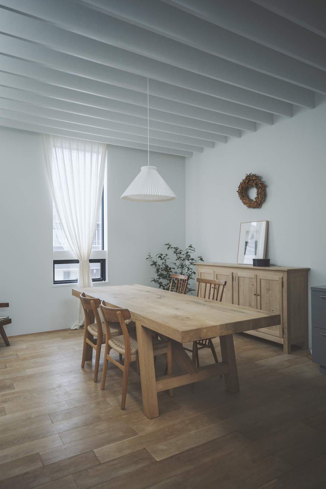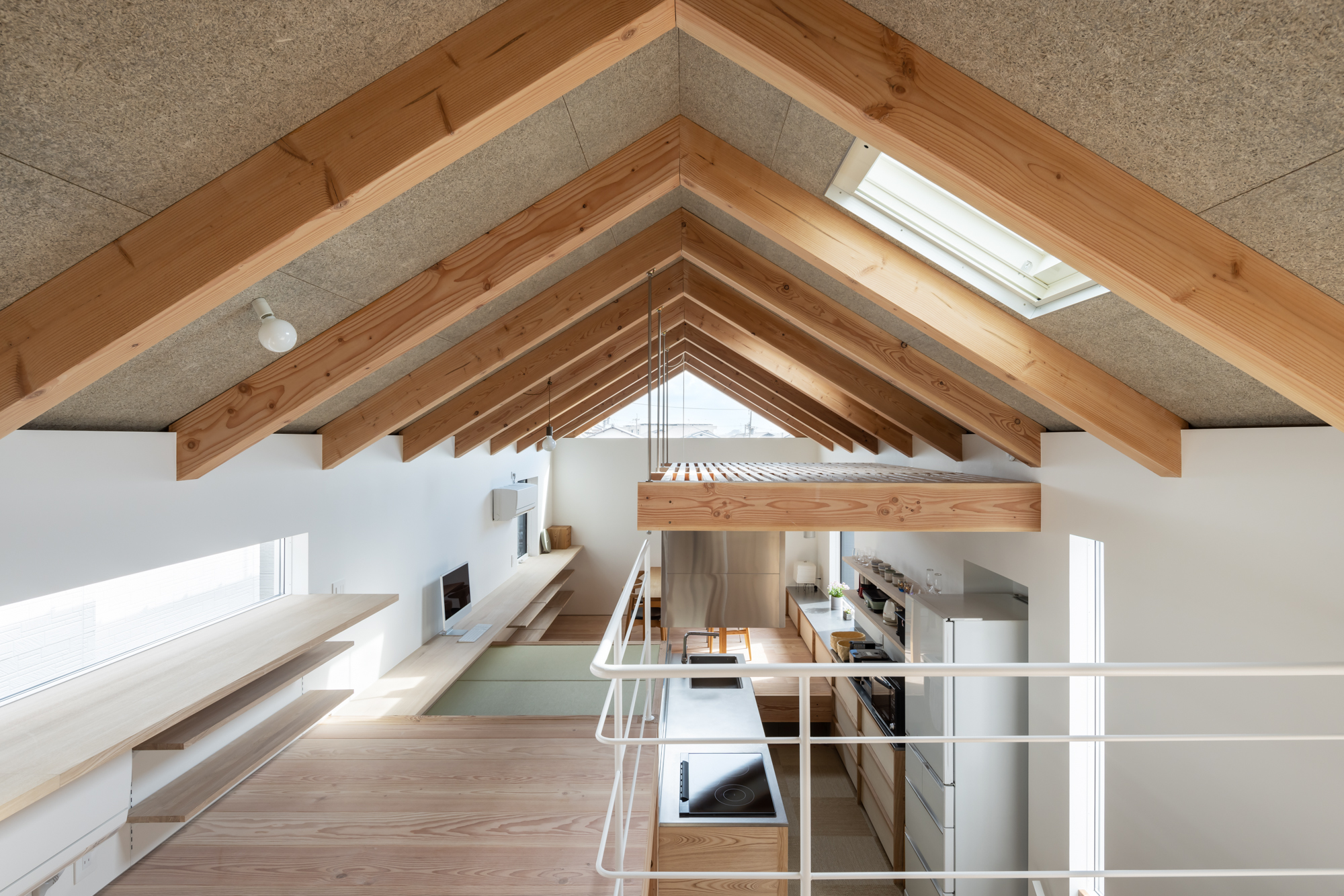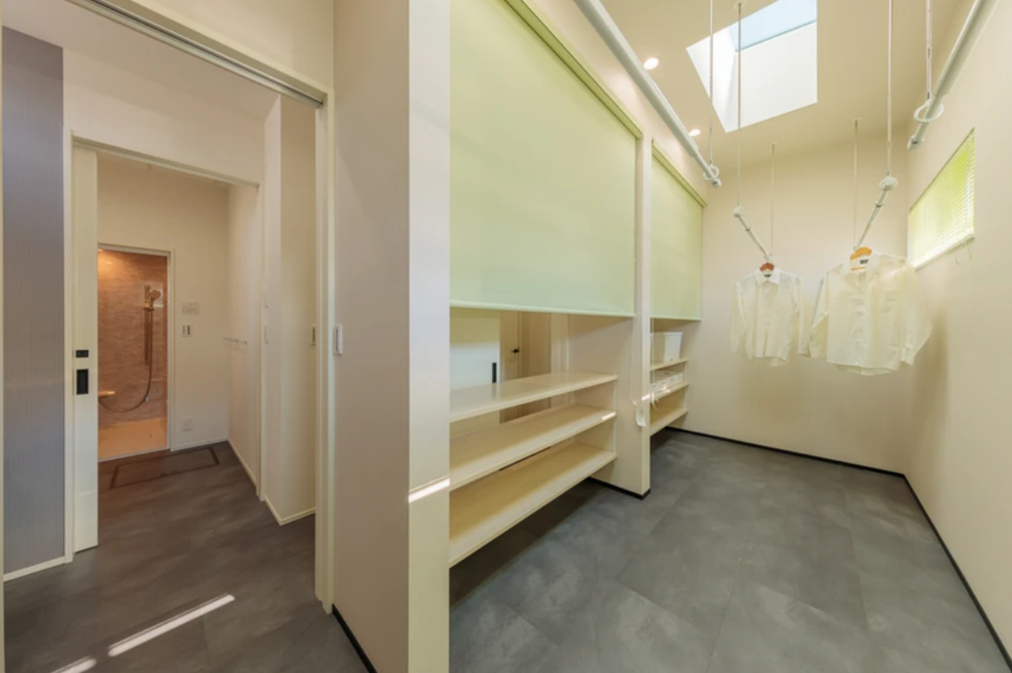 サンルームは天窓で日当たりもよく、洗濯を終えた洋服をすぐに片付けられるよう、収納棚を設置。上部にはハンガーバー、下部は可動棚になっています。収納棚のはオープン棚になっているので、廊下側からも洋服が取り入れできます。同じ場所でアイロンを掛けたり、洗濯が畳めるようテーブルを設置。