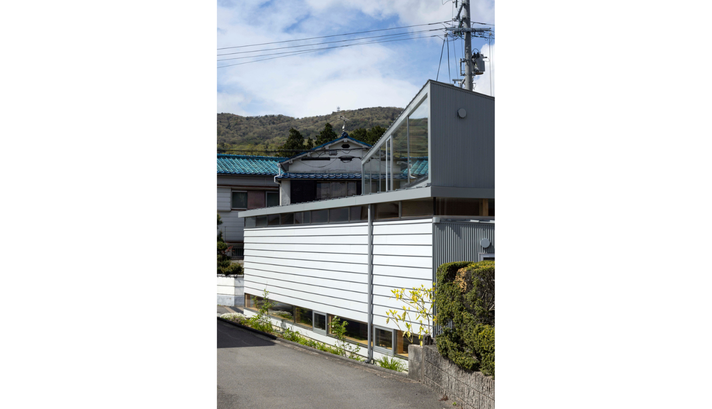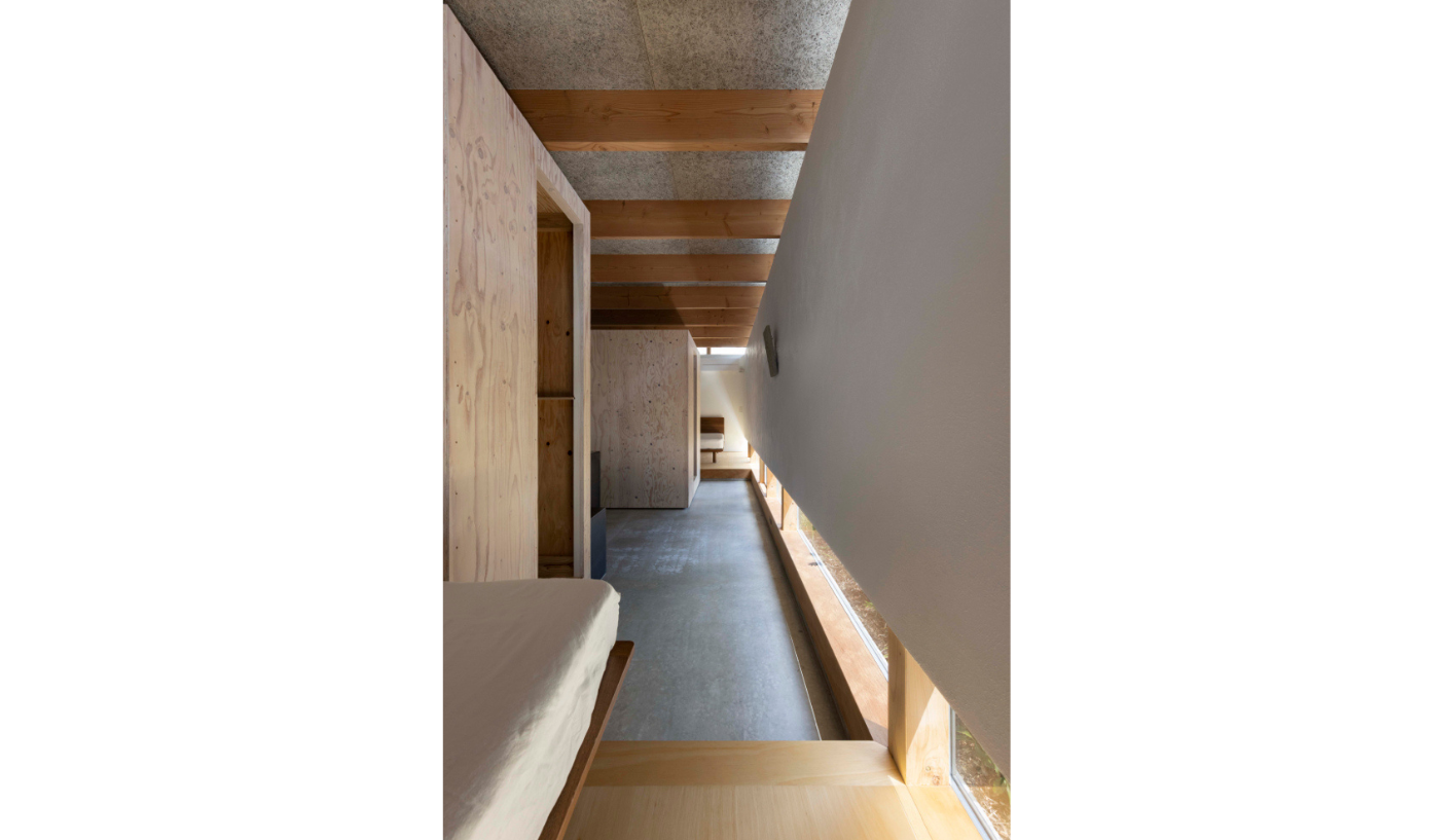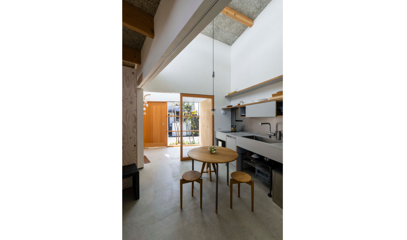 また、道路が隣接するため光の取り入れ方にも気を配りました。窓は上部と足元にのみ設けることで外からの視線を遮ります。そして吹き抜けを設けることで、吹き抜けを介して光が落ちるため、室内は一定の明るさを保ちます。さらに、玄関と土間リビングの間には木製の建具を設置し、外側と内側の曖昧な中間領域を作りました。道路と住居空間の間にワンクッション置くことで、心理的にも安心感が生まれます。