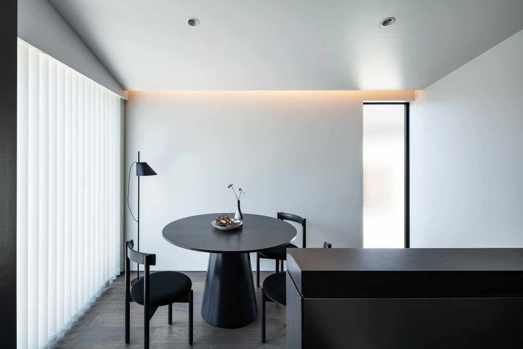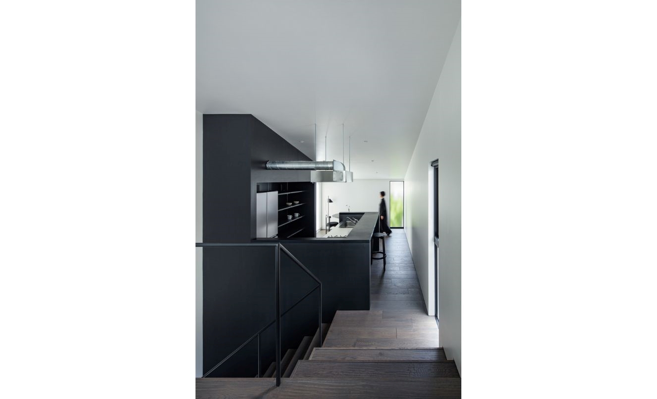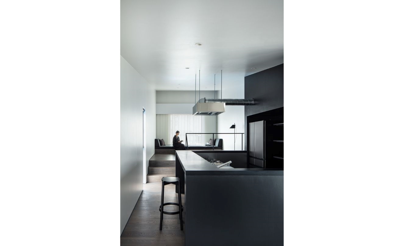 リビングとダイニングと述べたようにこの住まいでは2つの機能を分けています。壁で分断したわけではなく、空間としてはつながりながらキッチンを挟んで段差で緩やかに場面を切り替えた形です。