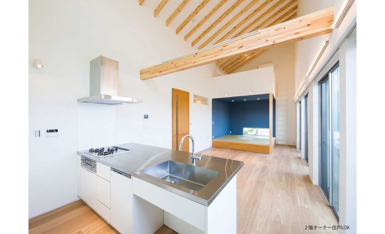 『Riganto』では、賃貸2戸を1階に確保しながら、オーナー家族がのびのびと暮らせるように設計を行いました。
