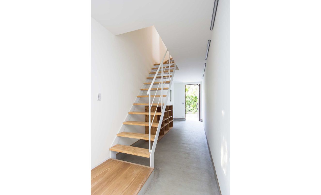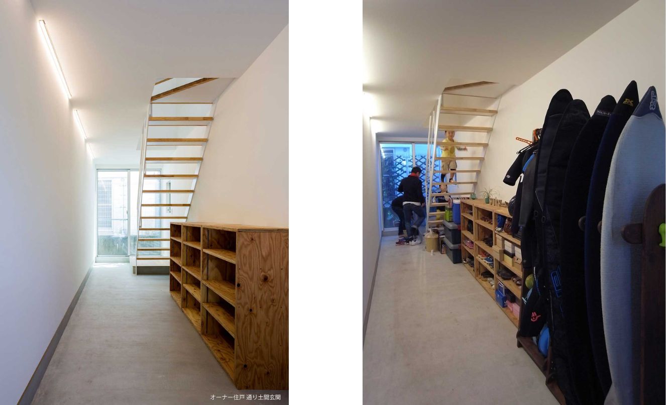オーナー家族の居住スペースは主に2階となりますが、家の顔となる玄関は1階に設けました。玄関に連なる1階の空間を多目的に使える通り土間とし、接地階にも専有スペースを確保しています。