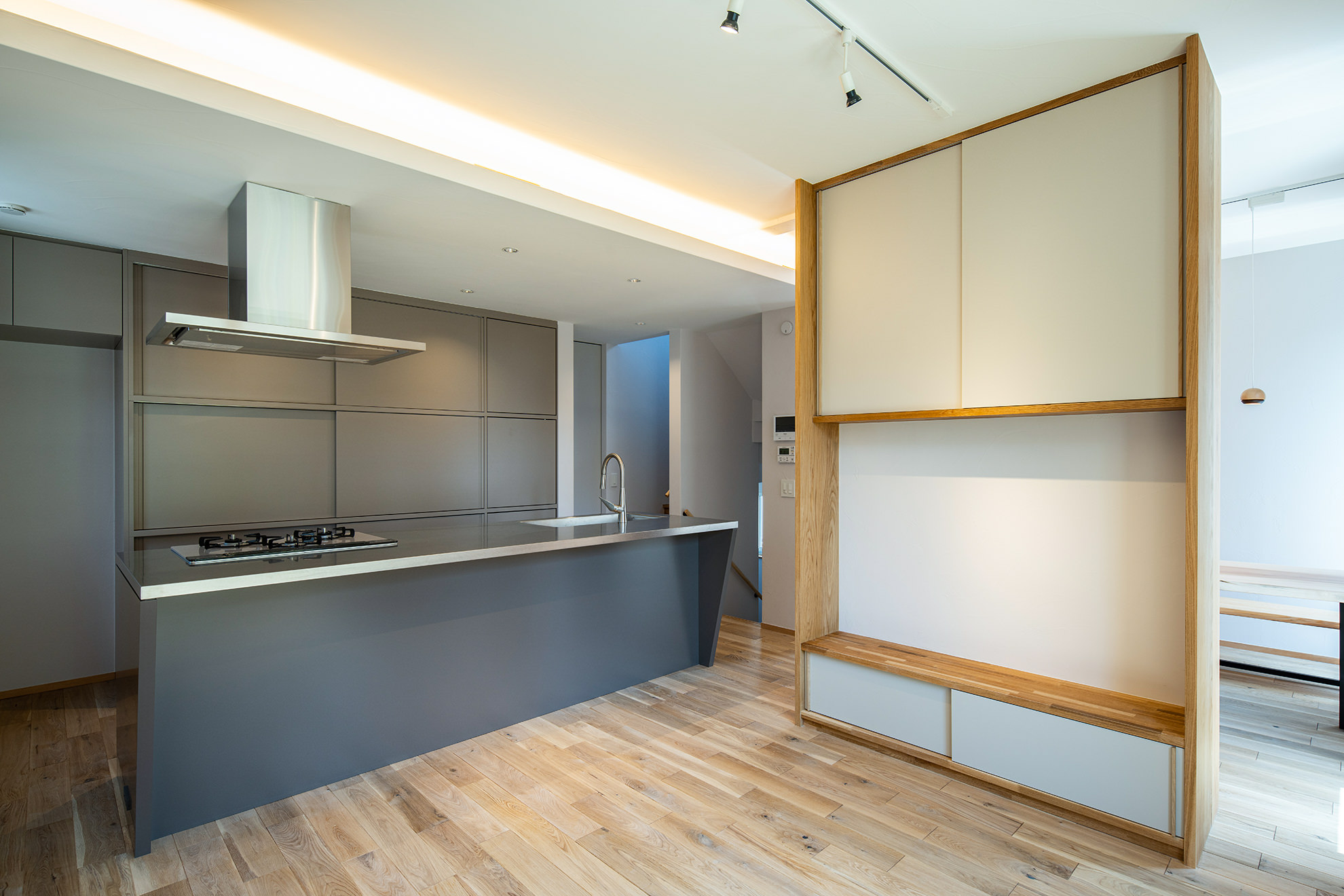 この住まいでは、訪れるお客様をダイニングに招きたいという声を受けて、少し囲まれた半個室のような空間に設計し、落ち着いて過ごしていただけるようにしました。LDKの真ん中に棚を配置して空間を分けつつも、回遊できる設計にすることで自由な動線を確保。リビングスペースに家族がいても気にせず、訪れたお客様との時間を快適に過ごせます。