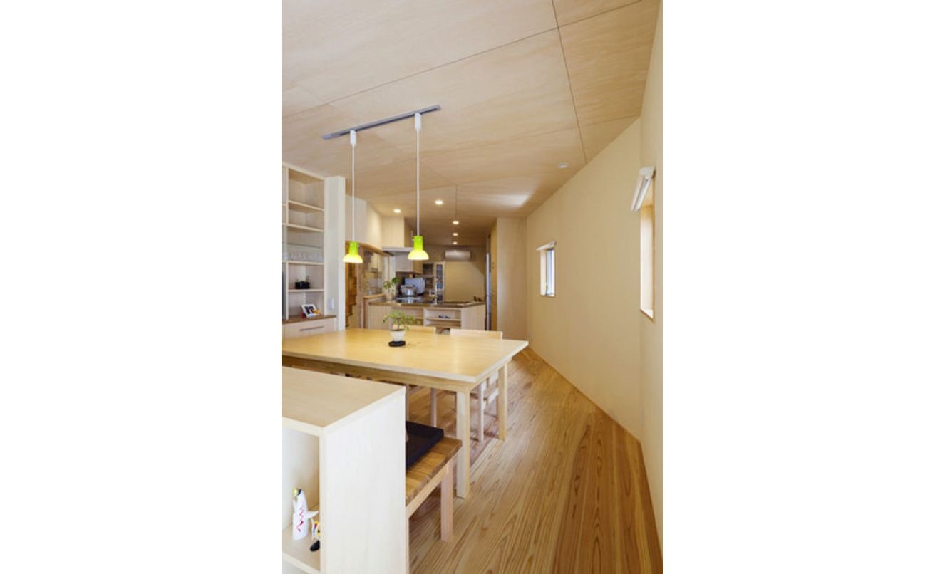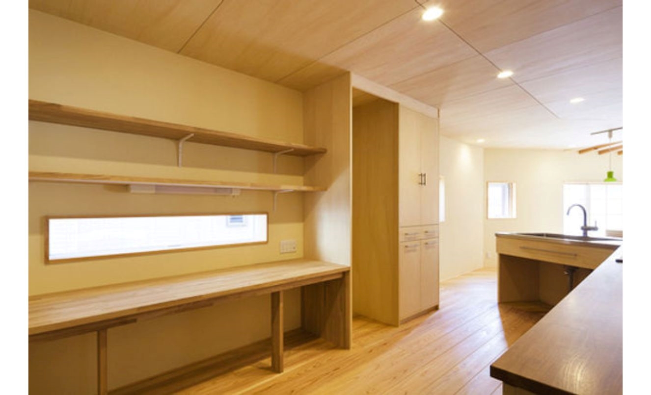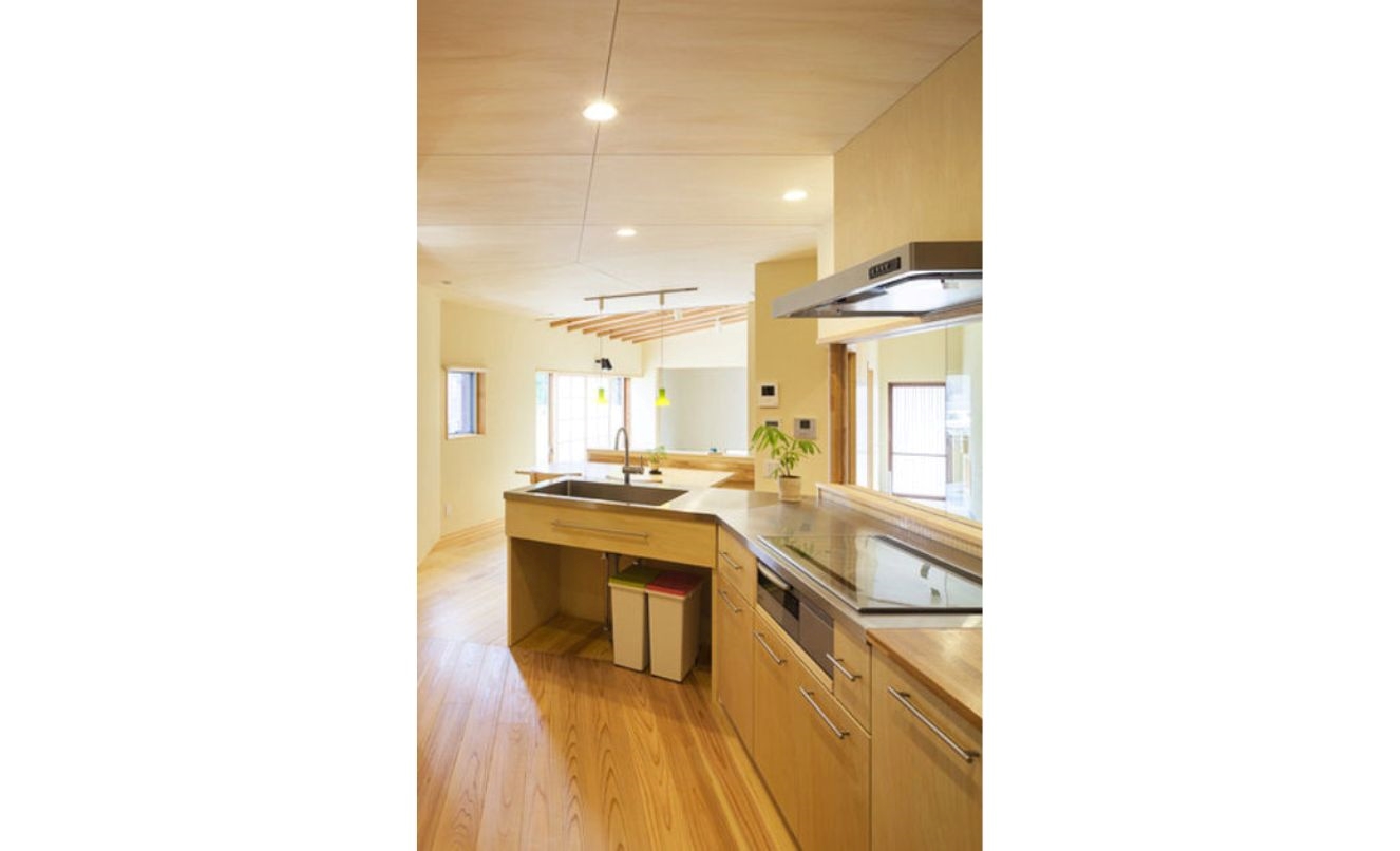 その連続した空間の中心に位置するのがキッチンです。家の形と反対の『くの字』型に少し開いたキッチンは玄関から家の奥までどちらの方向も見渡せ、家族の様子が把握できる司令塔のような場所です。ユーティリティースペース(家事スペース)をキッチンと連続する形で確保したので家の中を右往左往せずにその場で家事を完結させられます。家事をしていても孤立せず、家族の様子がわかり、効率的に家事を進められる空間です。