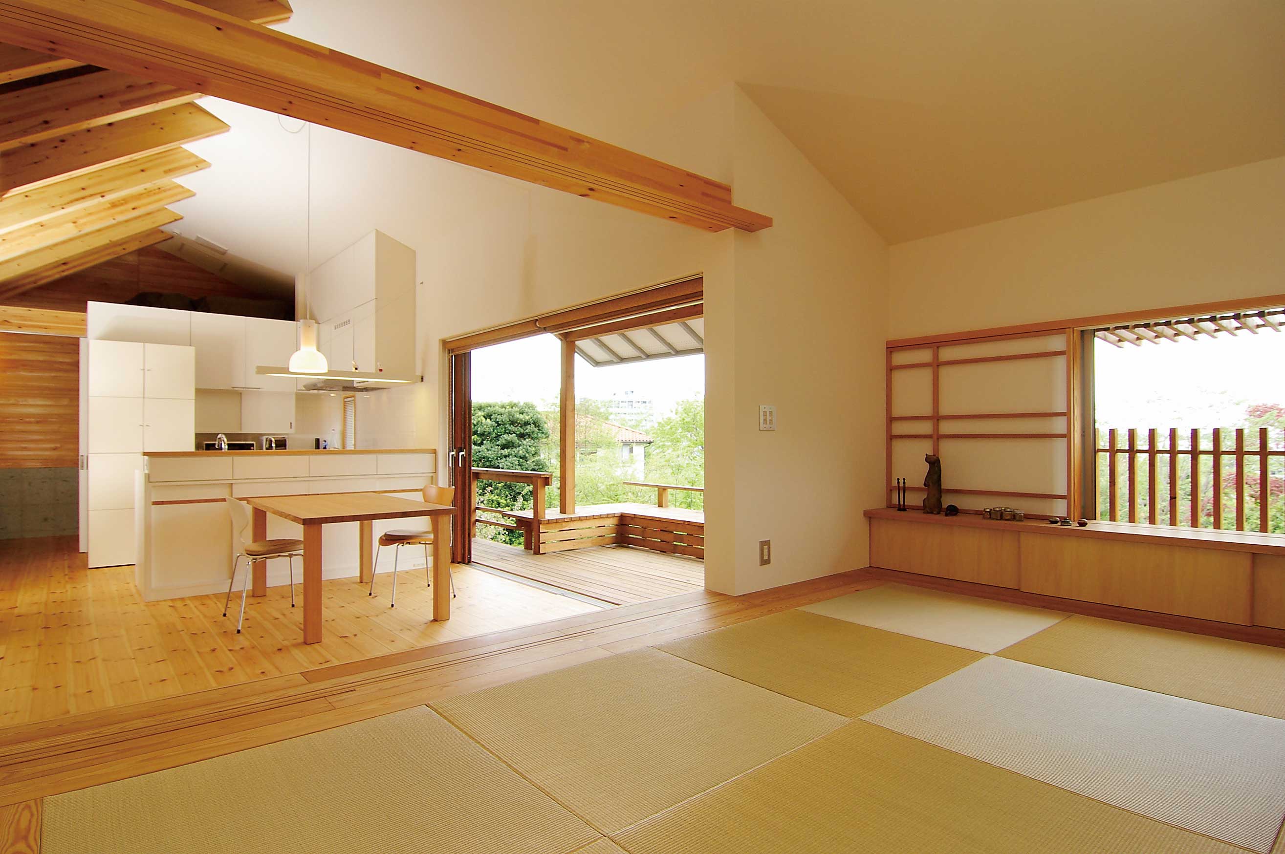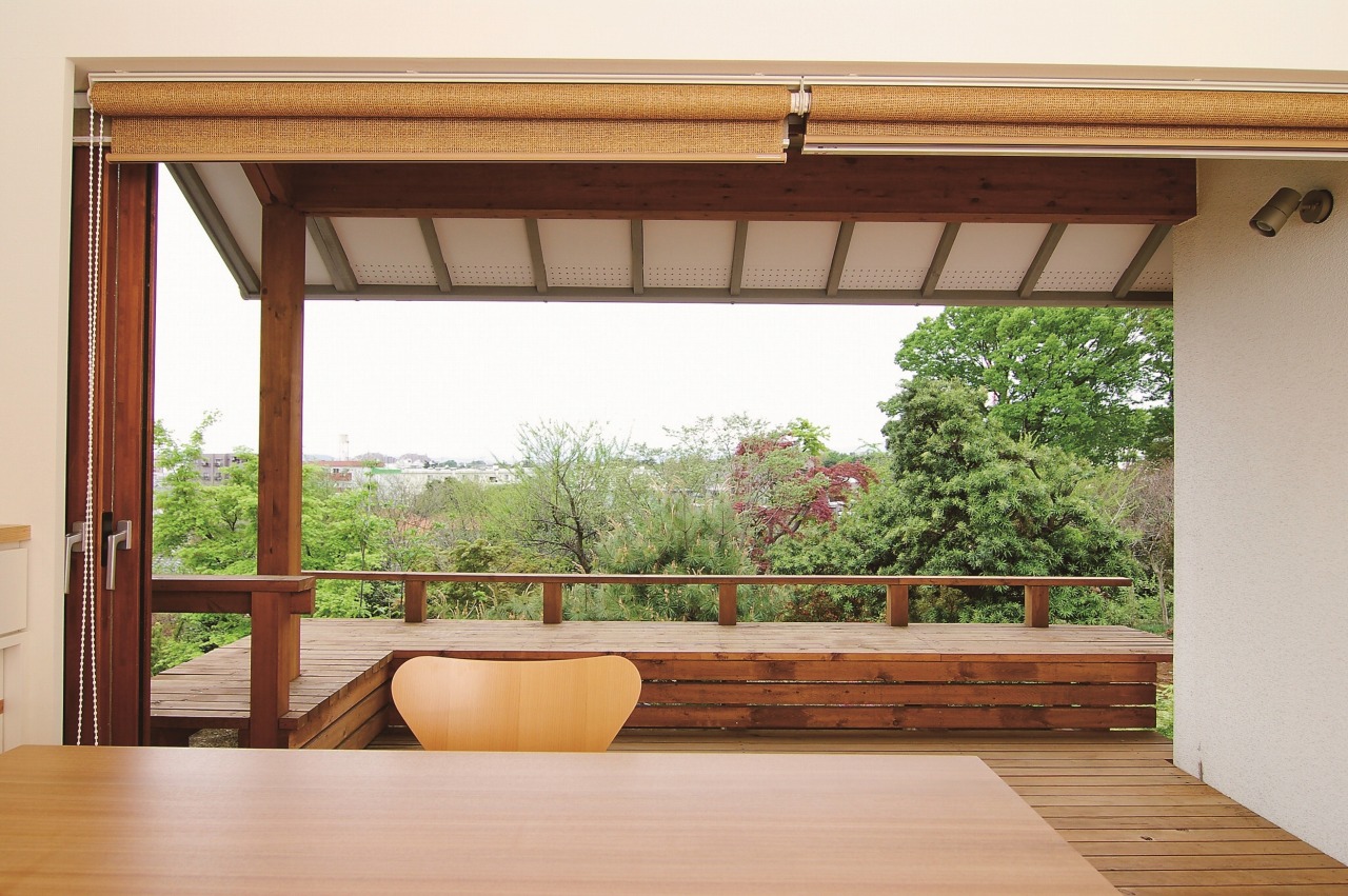リビングと大きなバルコニーを一体化するために、幅2間分(約3.6メートル)の開口部に特殊な木製サッシを採用し、全てのサッシを引き込んで開放できるようにすることで、室内外が一つの空間として利用できるようにしました。 バルコニーでは、通常の高さ(約1.1メートル)の手すりを設置すると、リビングで腰掛けた時に富士山が見えなくなってしまうため、この住宅では手すりの高さを約70センチに抑え、さらに安全性を確保するためにベンチを設置しました。ベンチの奥行きを深く取ることで、安心感と快適さを両立させています。