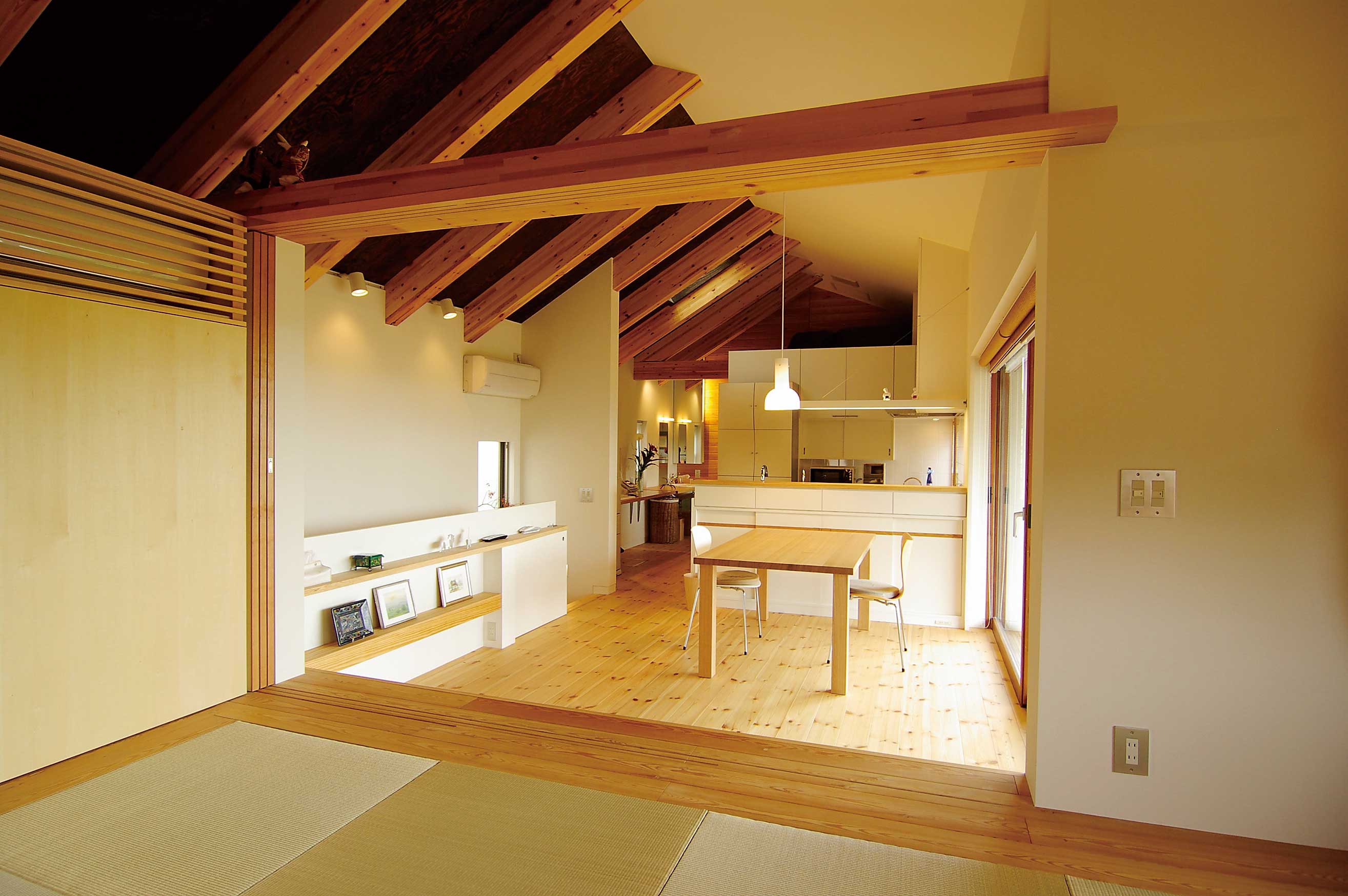リビングの一角に位置する和室の窓には、既製品の4枚引きアルミサッシを使用し、4枚のうち中央の2枚のみを開口として利用。残りの2枚は壁の奥に引き込んで隠すことで、アルミのサッシ部が見えません。既製品のアルミサッシを工夫して用いることで、コストを抑えながら空間全体の調和を損なうことなく仕上げました。