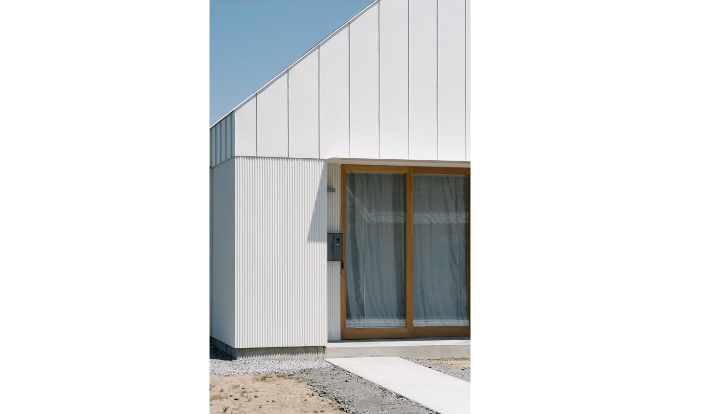 屋根から外壁へと繋がる竪ハゼラインを下部まで張り下げず軒ができる高さで止め、その先はガルバリウムの形状を変えて張り下げています。これによって横長に見えるデザインを強調し全体のバランスを取っています。