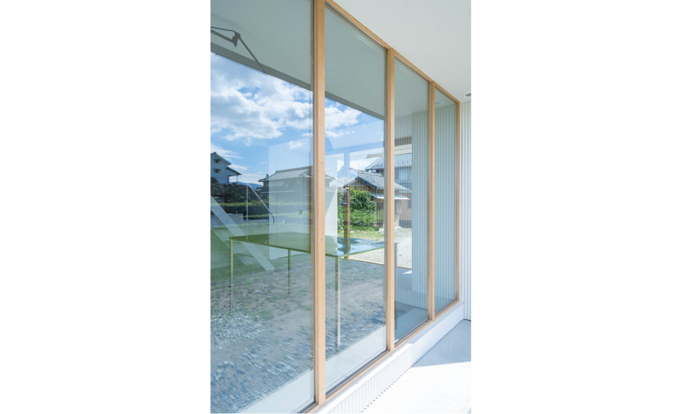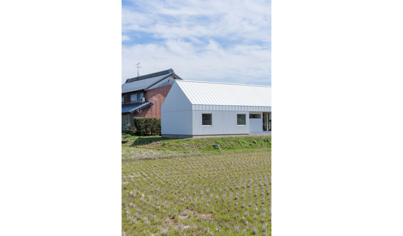 玄関となる大きな3枚の木製引き戸は外壁から少し奥まった位置に配し、さらに薄い鉄板で作った小庇を設けて雨から建具を守ります。