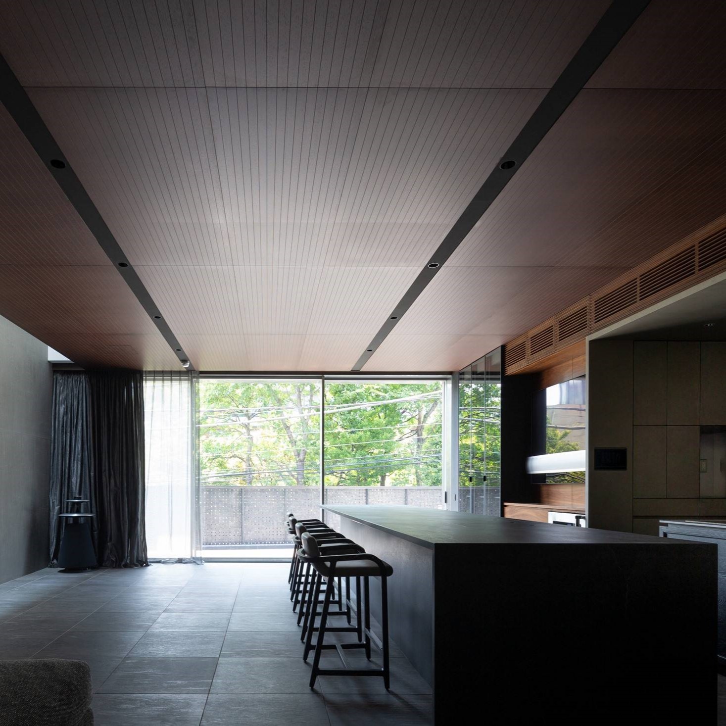 これらの工夫により、カーテン無しで南北の緑豊かな眺望を楽しむことが出来るリビングが生まれました。