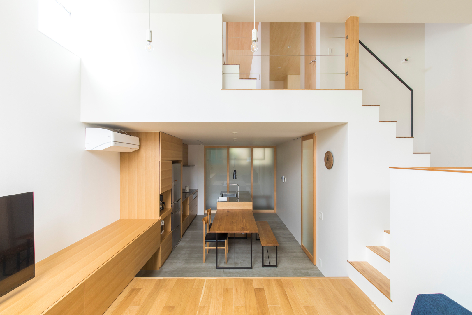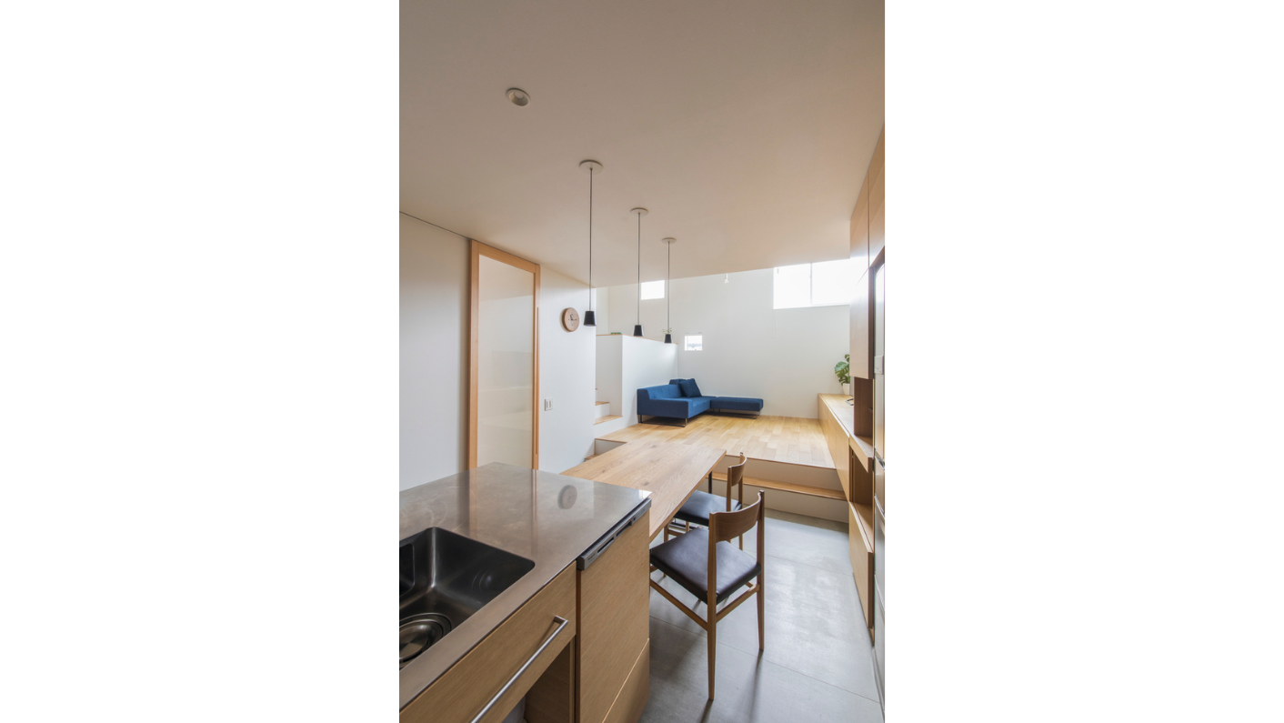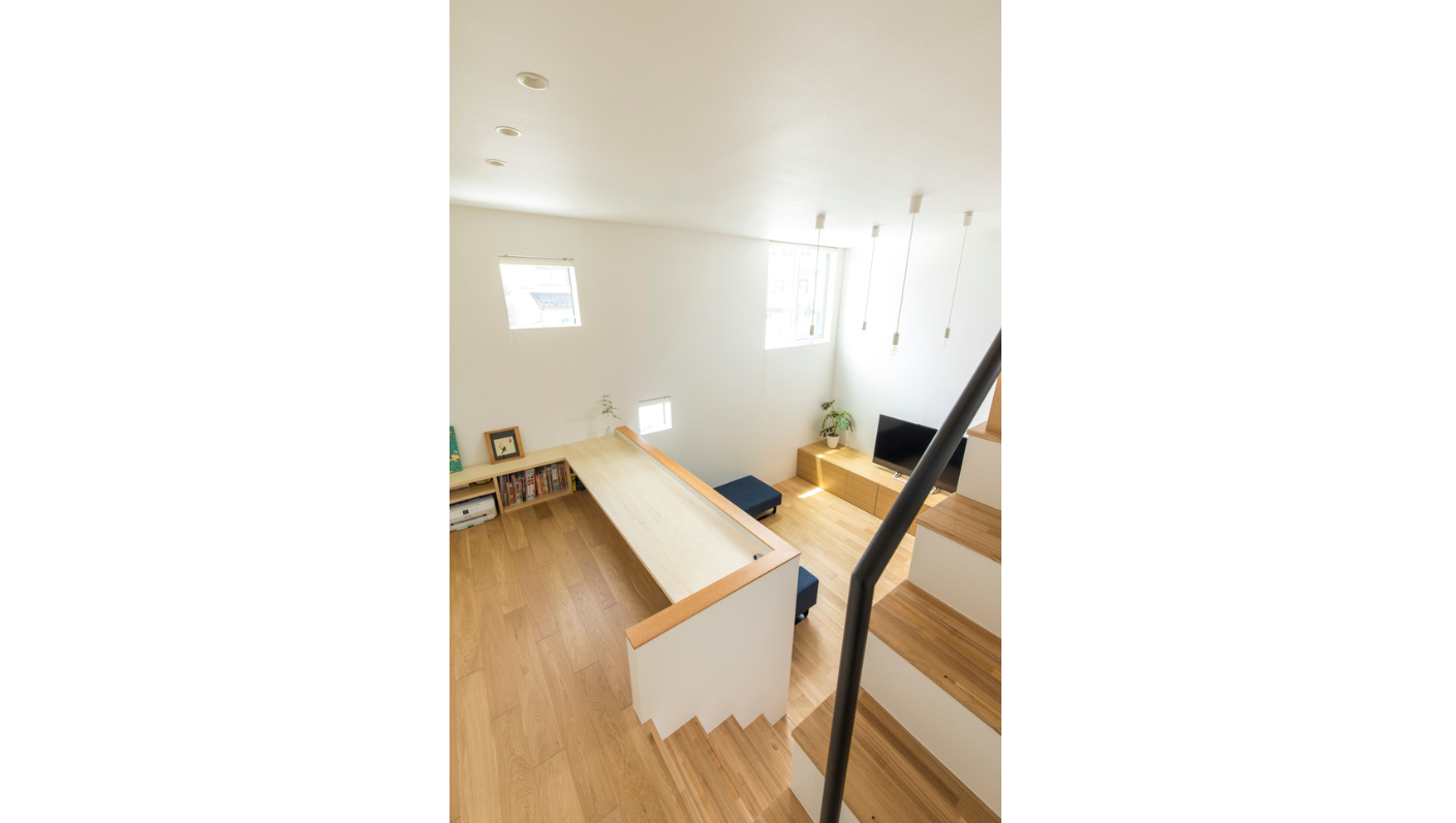 仲の良いご家族なので、このスキップフロアを活かし、完全に個室で分けるのではなく、段差を利用して個々の居場所を作りながら、家族全員が優しくつながる住まいとなりました。家族やその友人たちが、それぞれの居場所で自然とコミュニケーションを生み出し、楽しい住まいになったことが印象的です。
