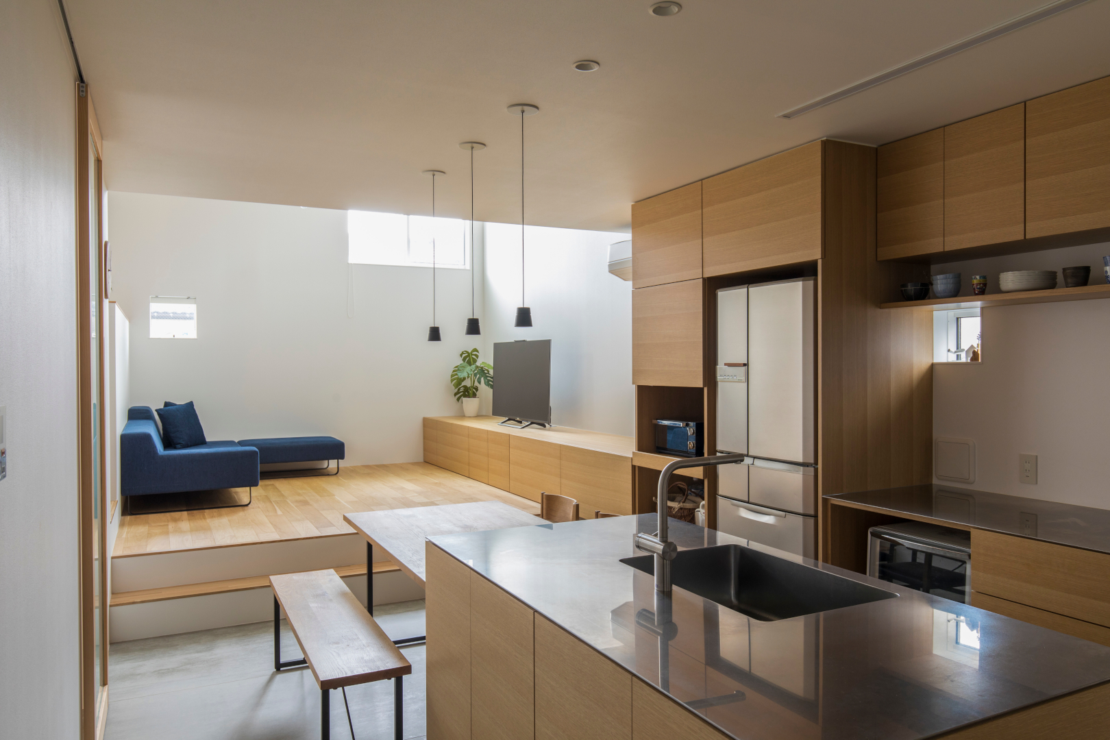 まず、リビングにはステップフロアを設け、窓を高い位置に配置することで、視線を気にすることなく自然光を取り込みます。これにより、開口部が少なくても住宅の奥まで光が届き、リビング奥のキッチンやサンルームにまで明るさが行き渡ります。