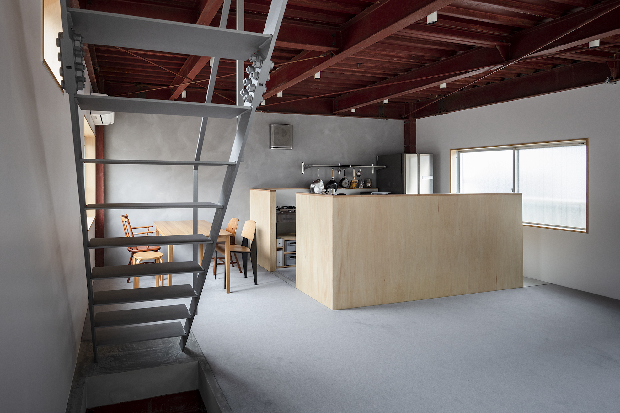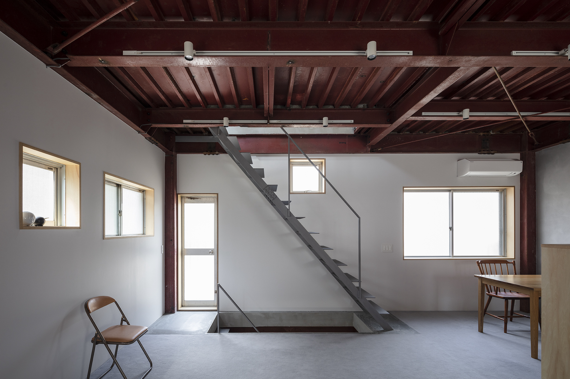 こちらの住宅は、リノベーション前には室内が解体され、様々な高さや大きさの窓が点在していました。一見統一感のない窓配置が逆に魅力となり、パラパラと入る光が空間に個性を与えます。さらに、天井や柱などの鉄骨では、錆び止めの色味や質感をあえてそのまま残し、オリジナルのテクスチャーを大切にしています。
